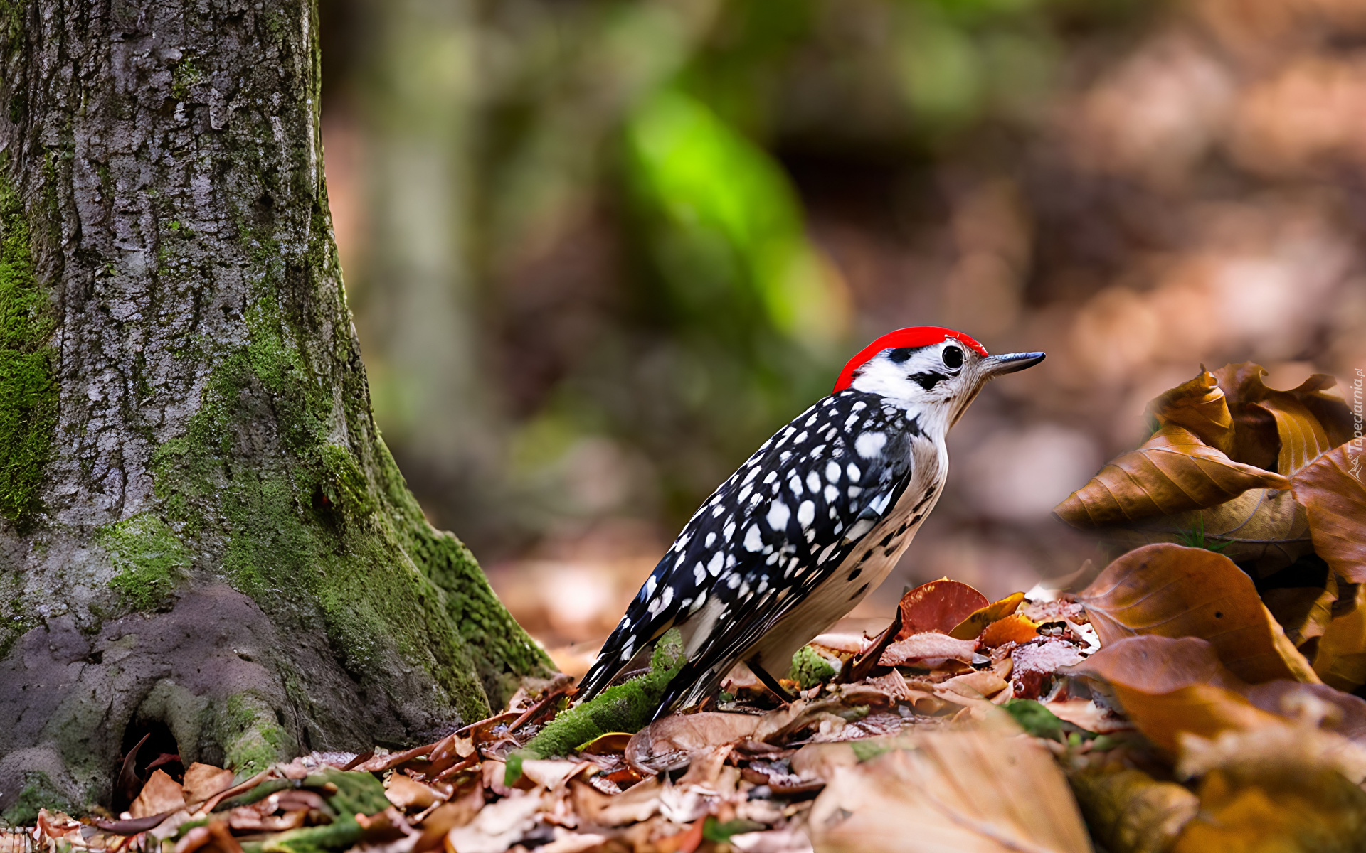 Edytor tapety: Dzięcioł na suchych liściach obok omszałego drzewa