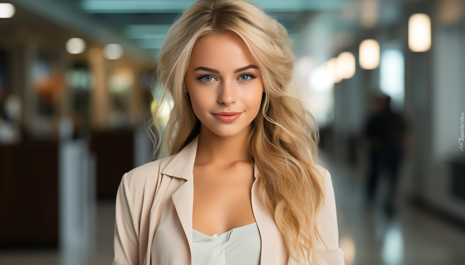 Edytor tapety: Długowłosa blondynka z uśmiechem na ustach