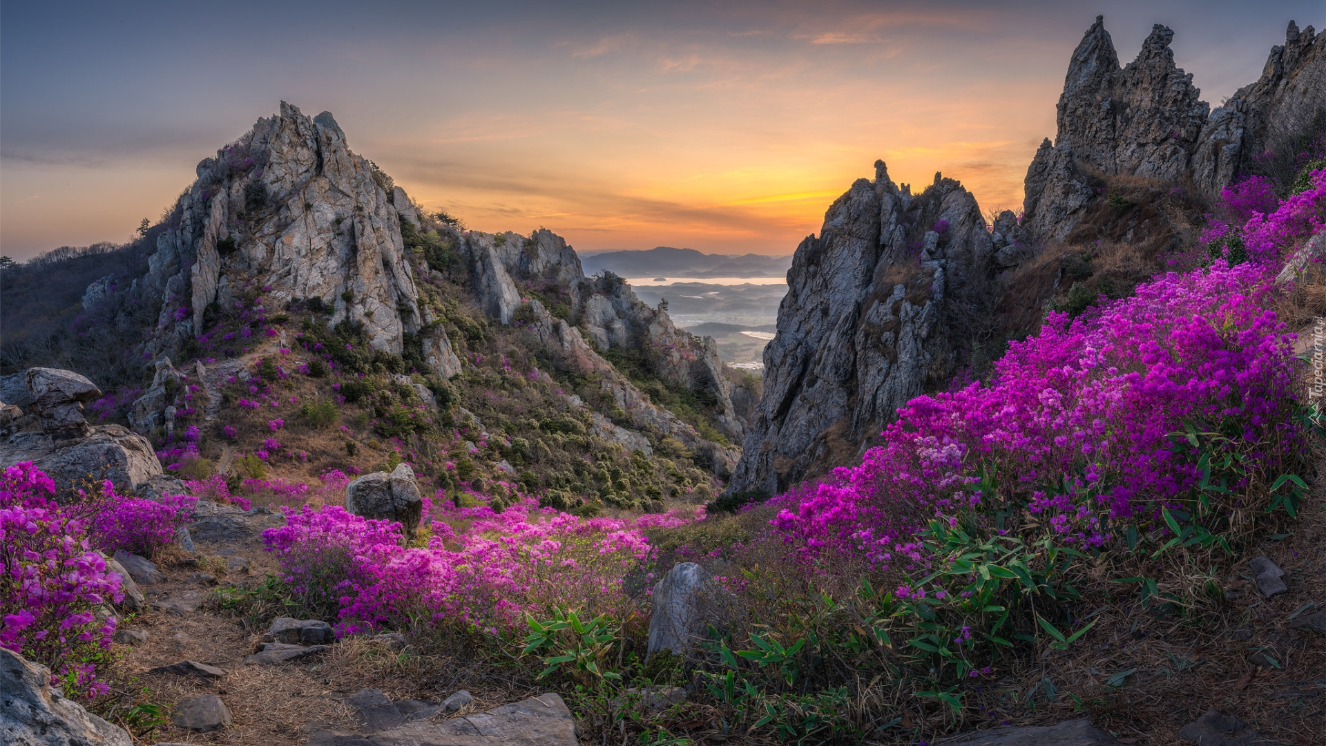 Edytor tapety: Rododendrony u podnóża skalistych gór