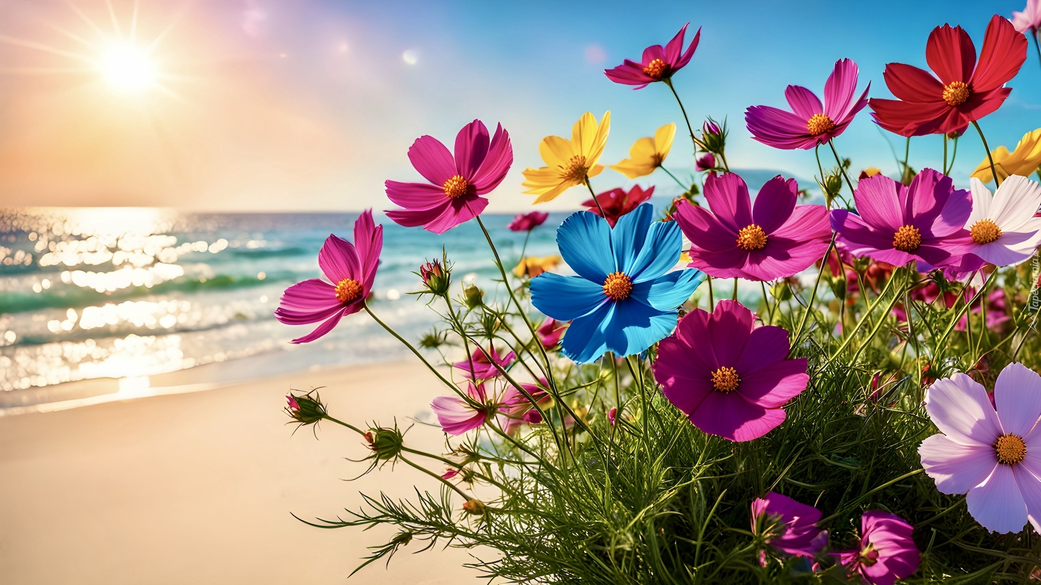 Edytor tapety: Kolorowe kosmee na tle morza i plaży