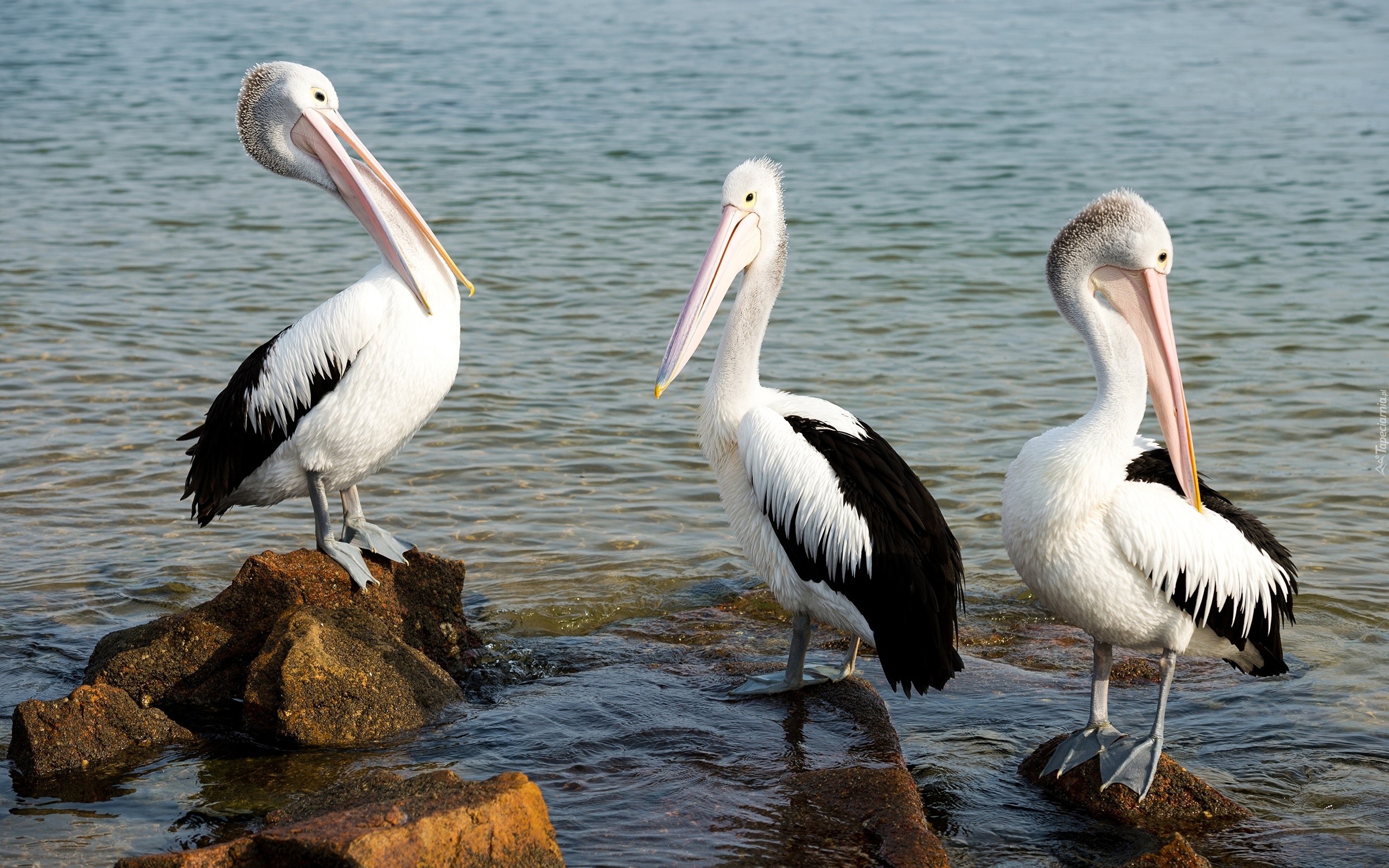 Edytor tapety: Trzy pelikany na kamieniach w wodzie