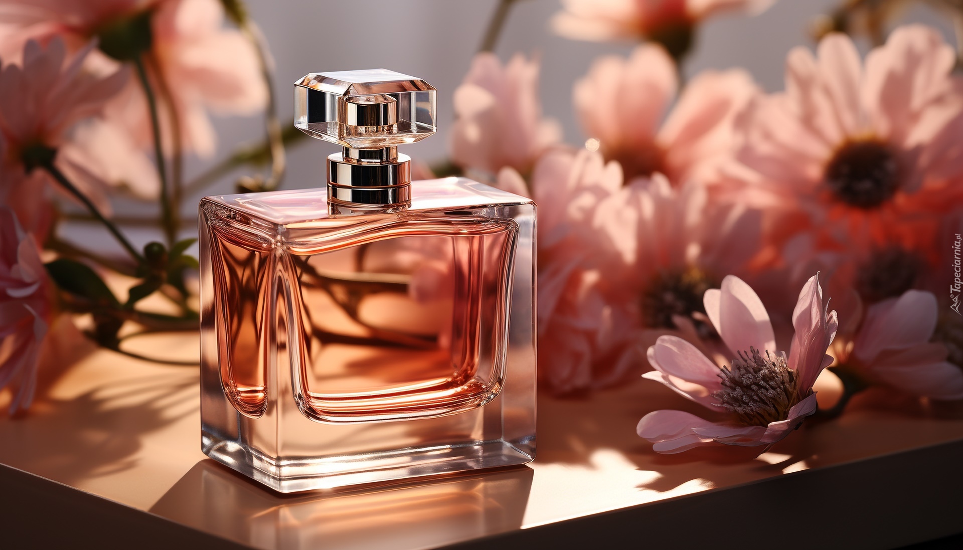 Edytor tapety: Flakon z perfumami na stole obok kwiatów
