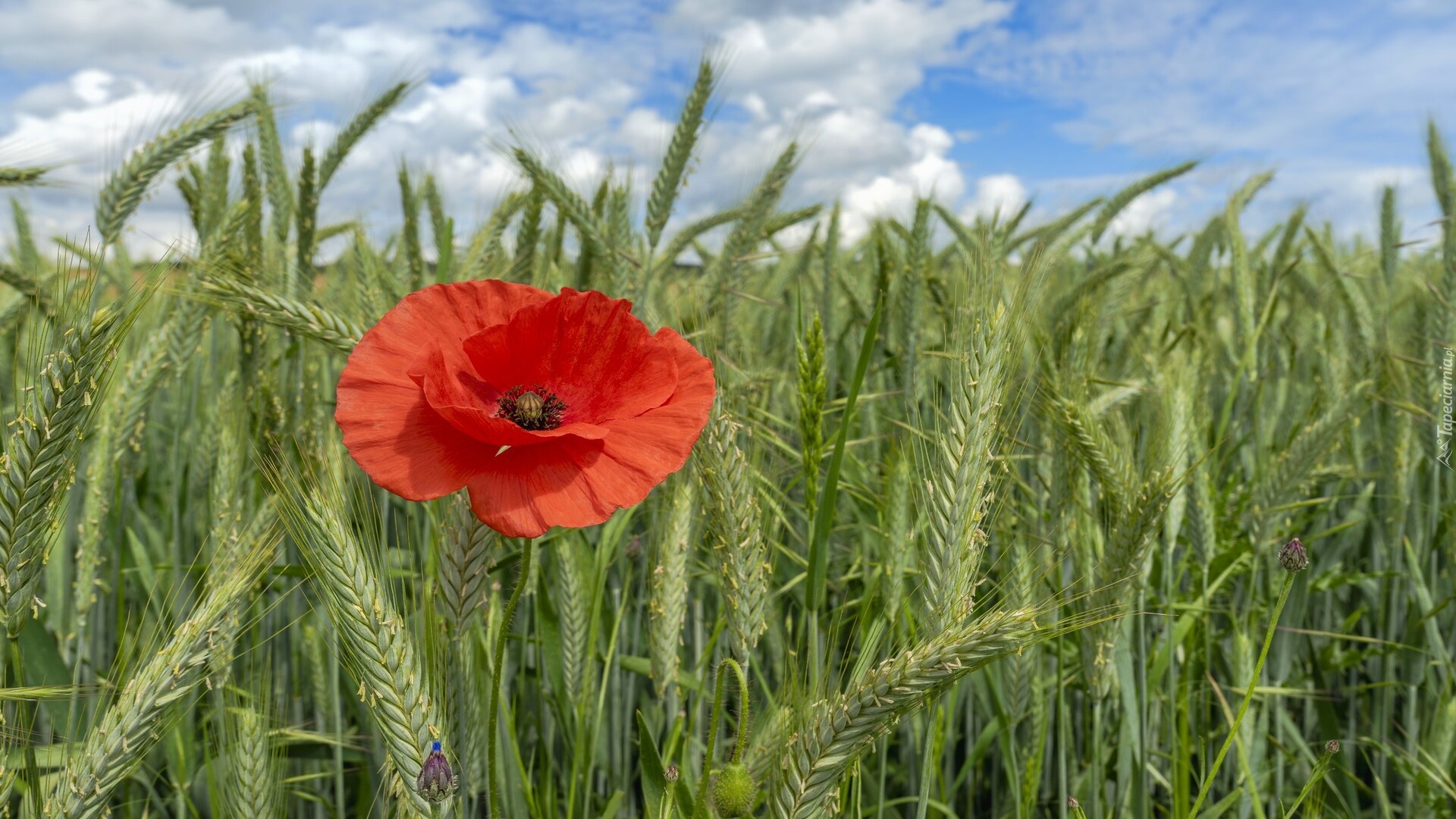 Edytor tapety: Czerwony mak w zielonym zbożu