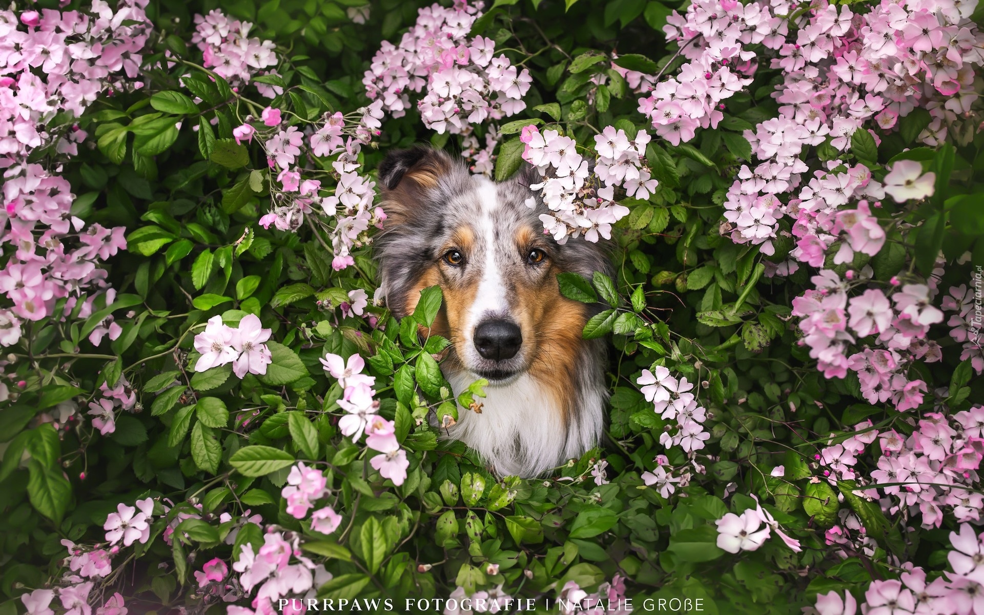 Edytor tapety: Głowa psa wśród kwitnących gałązek