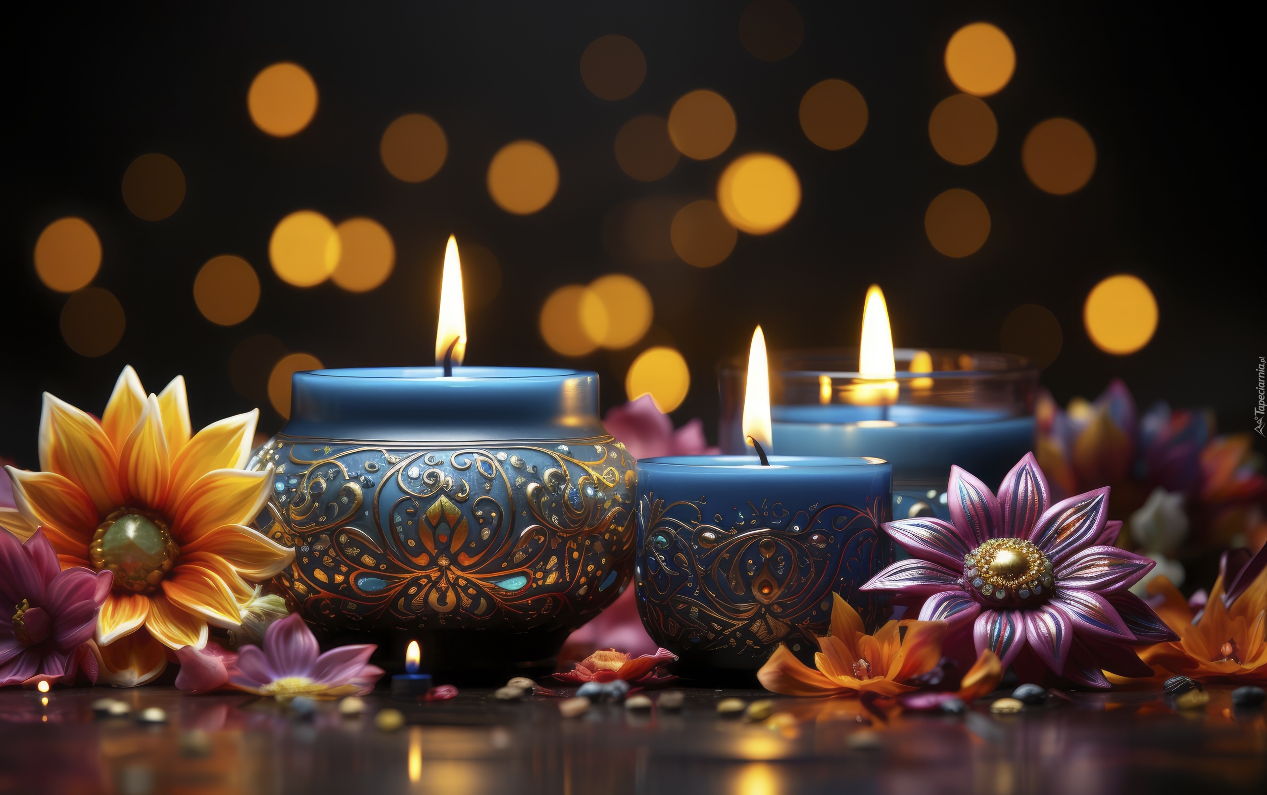 Edytor tapety: Trzy płonące świece i kwiaty na tle światełek