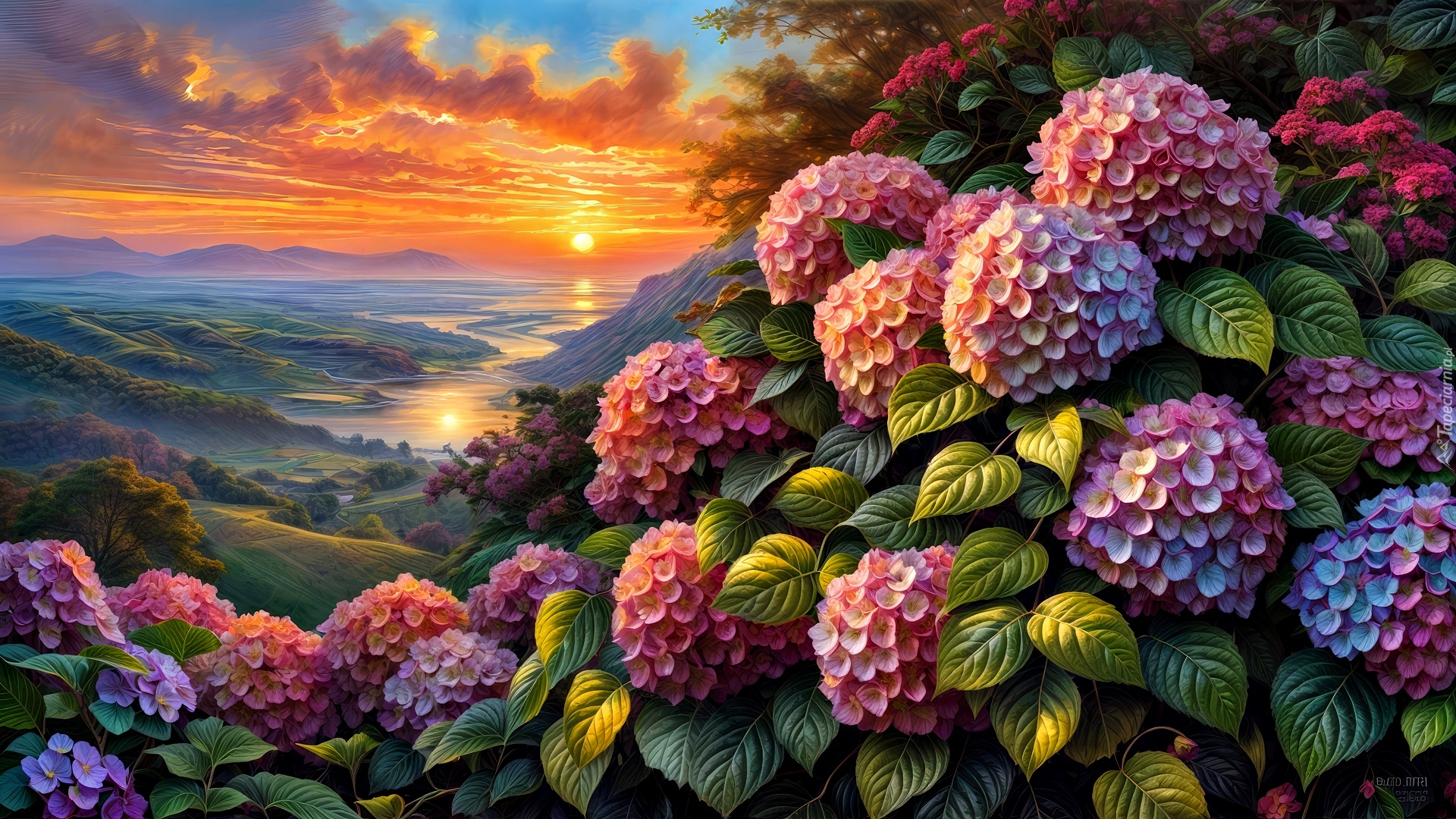 Edytor tapety: Rzeka w blasku słońca i rozświetlone hortensje