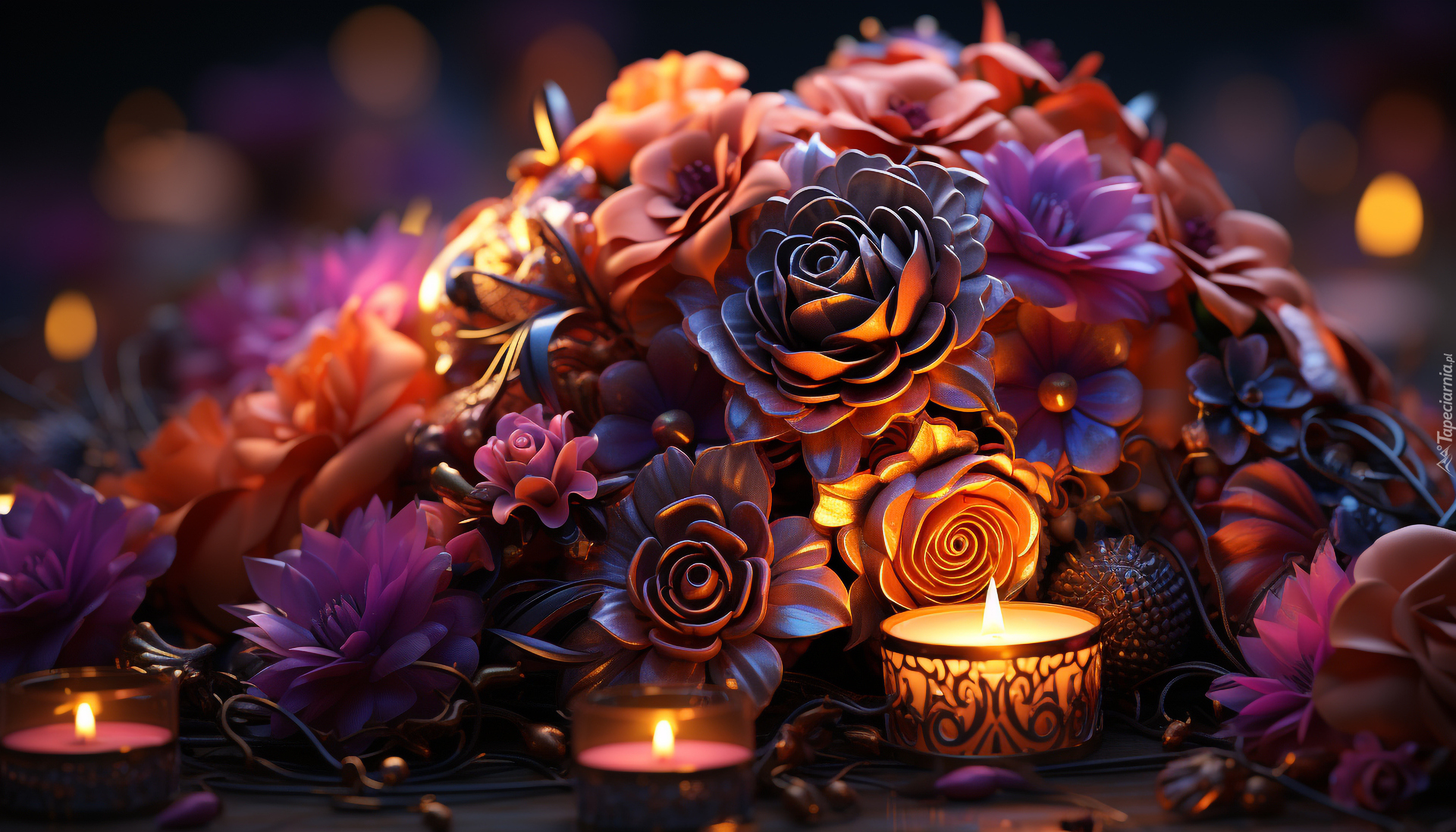 Edytor tapety: Rozświetlone blaskiem świec kolorowe kwiaty