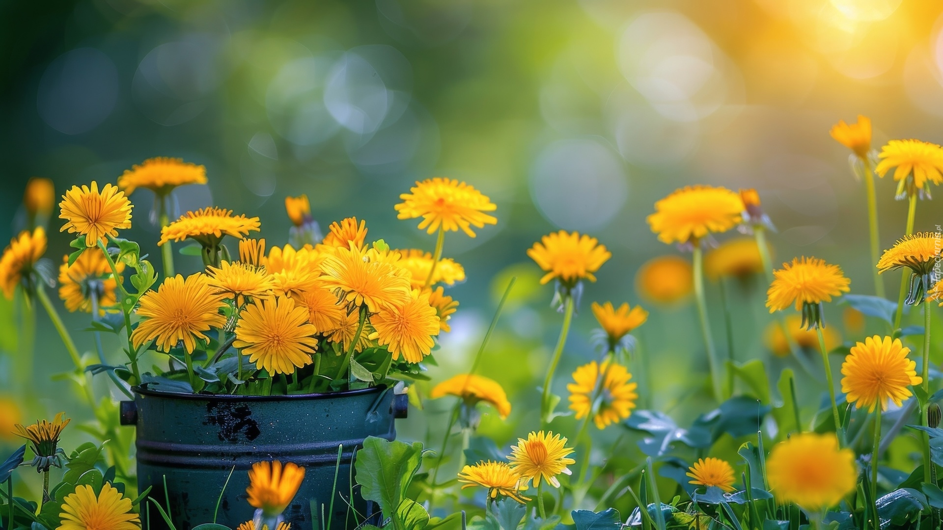Edytor tapety: Wiaderko z mniszkami na łące