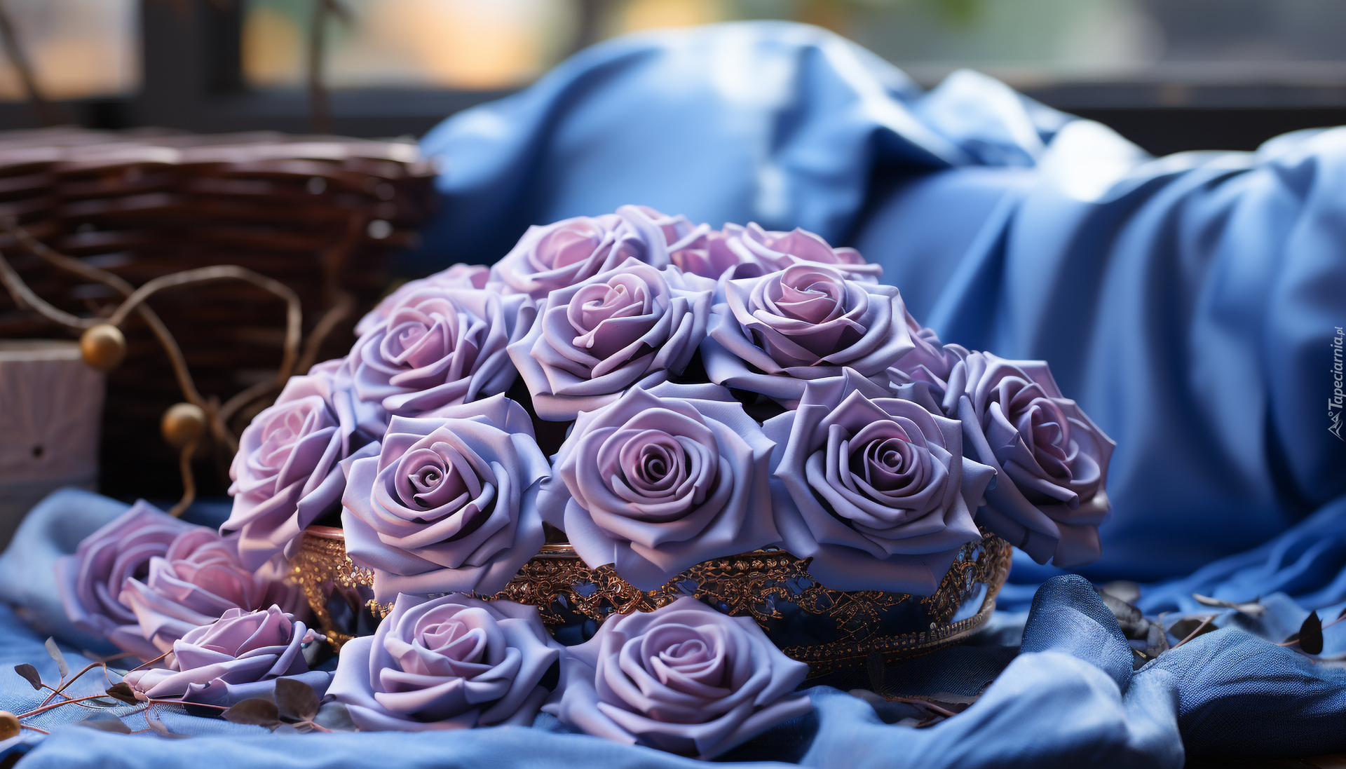 Edytor tapety: Fioletowe róże na niebieskiej tkaninie