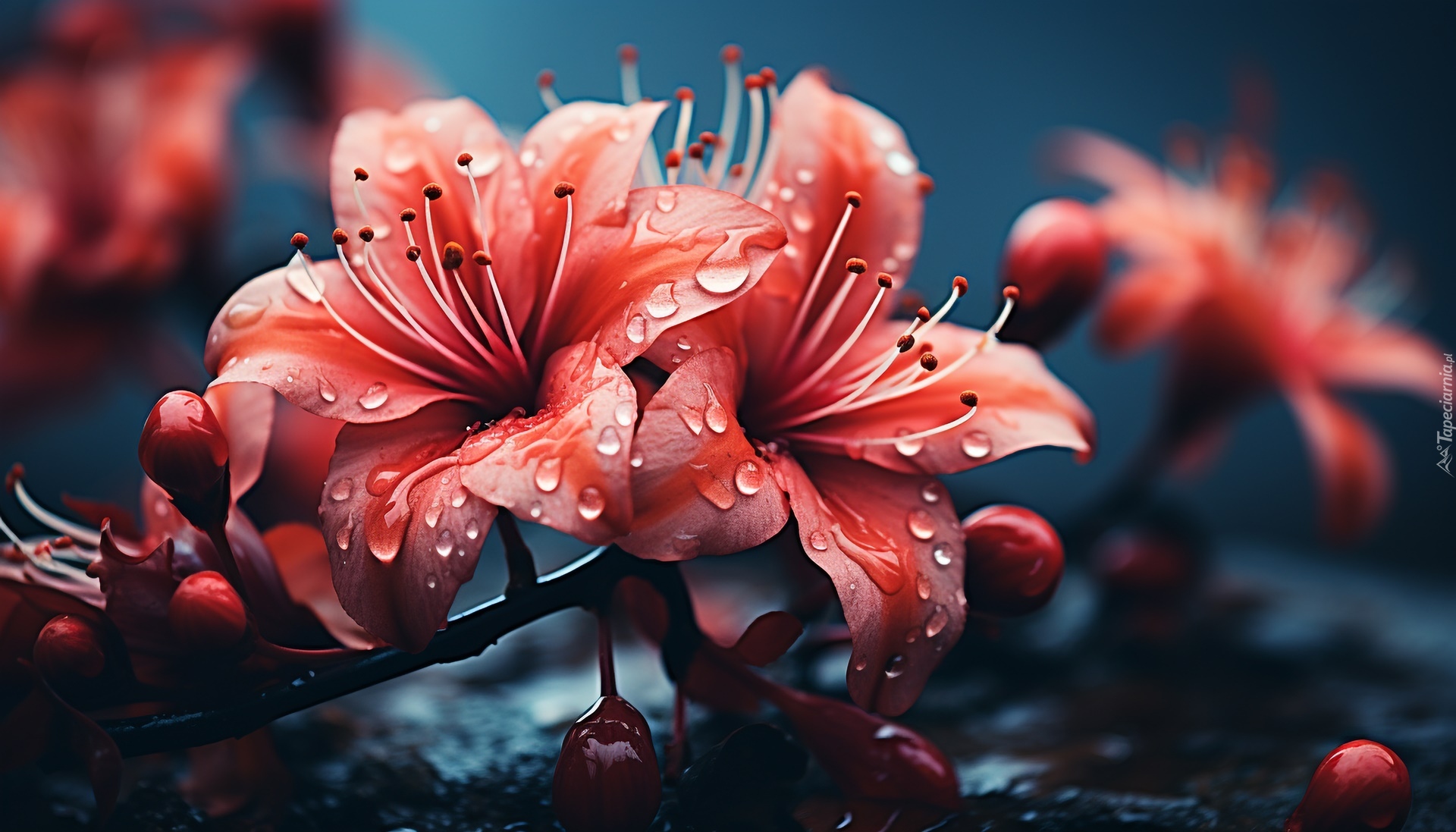 Edytor tapety: Czerwone kwiaty z kroplami wody na gałązce