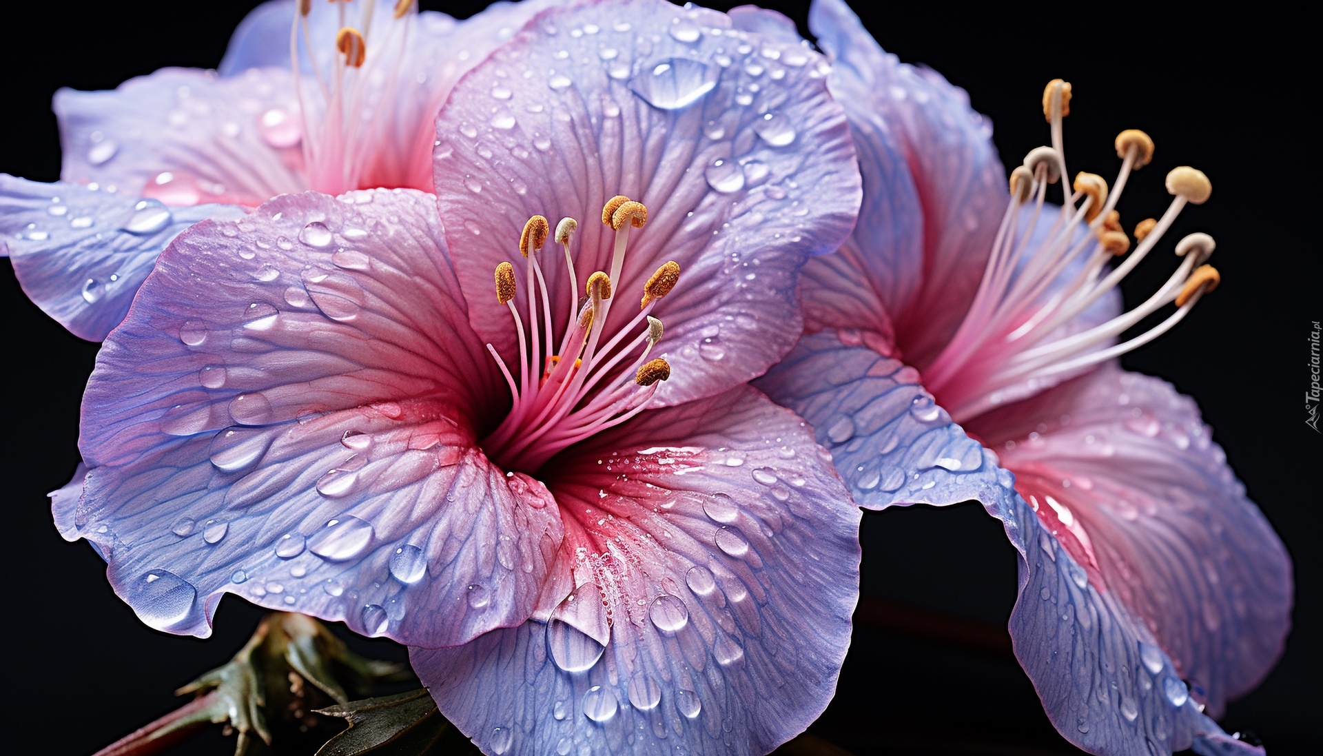 Edytor tapety: Rozwinięte kwiaty z kroplami wody na czarnym tle
