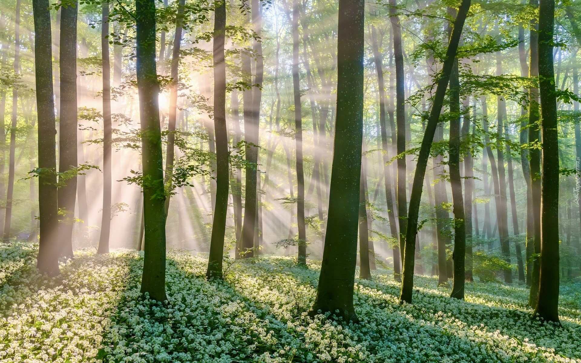 Edytor tapety: Czosnek niedźwiedzi pod drzewami w promieniach słońca