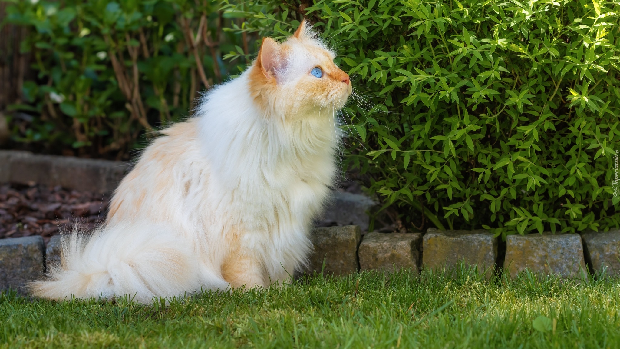 Edytor tapety: Kot na trawie obok krzewów