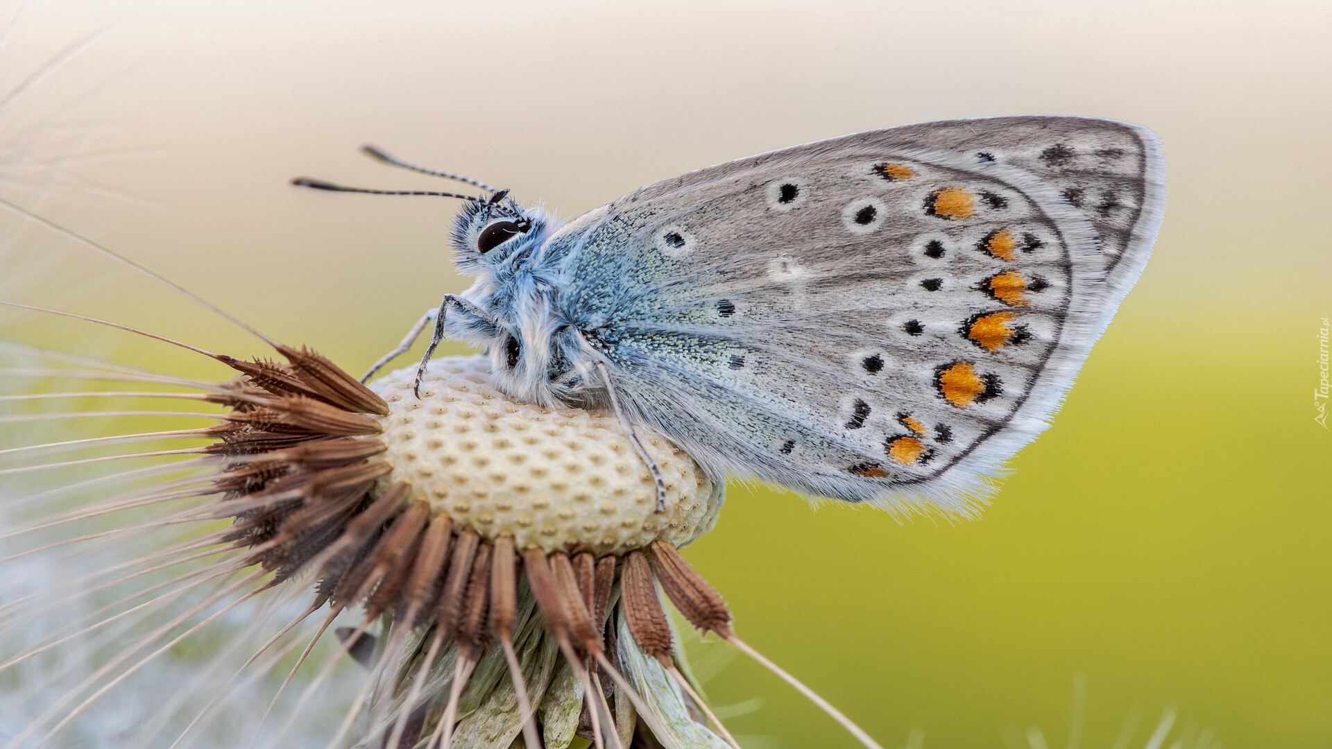 Edytor tapety: Modraszek ikar na dmuchawcu w zbliżeniu
