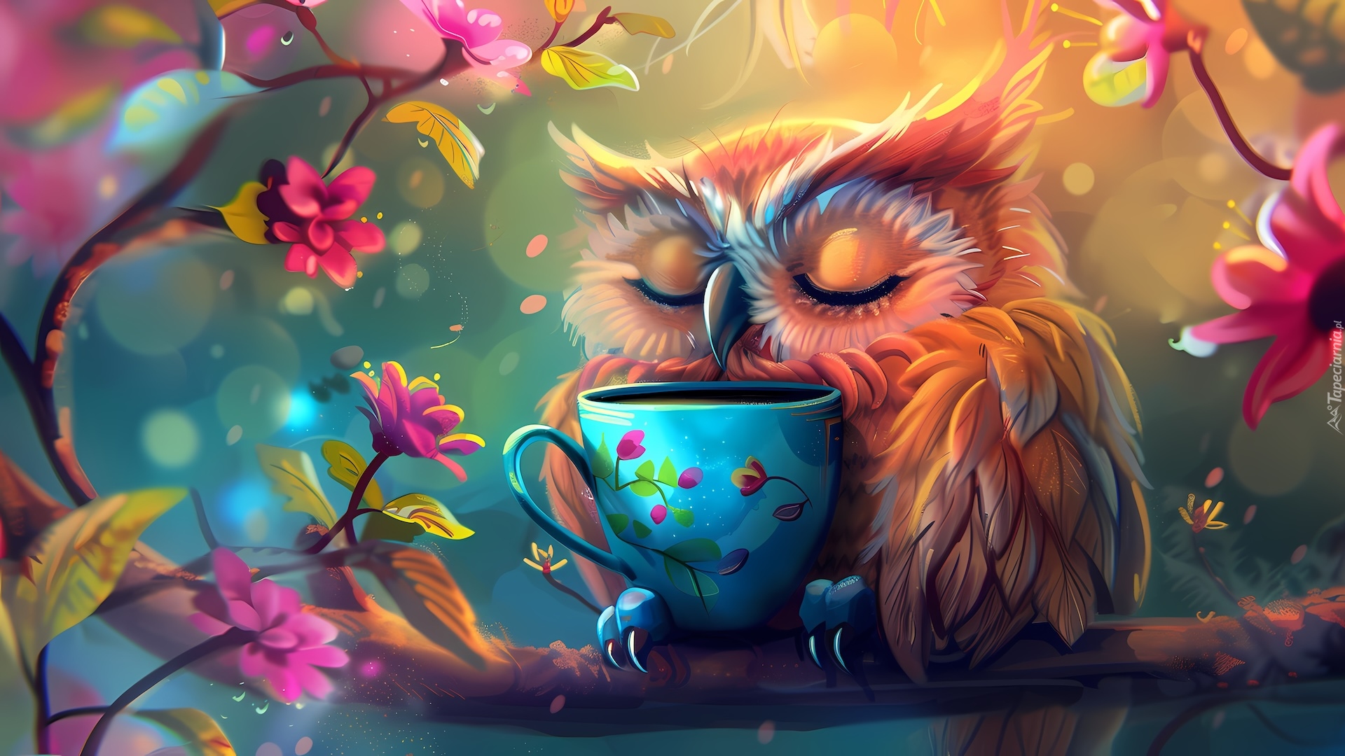 Edytor tapety: Sowa z filiżanką na ukwieconej gałęzi
