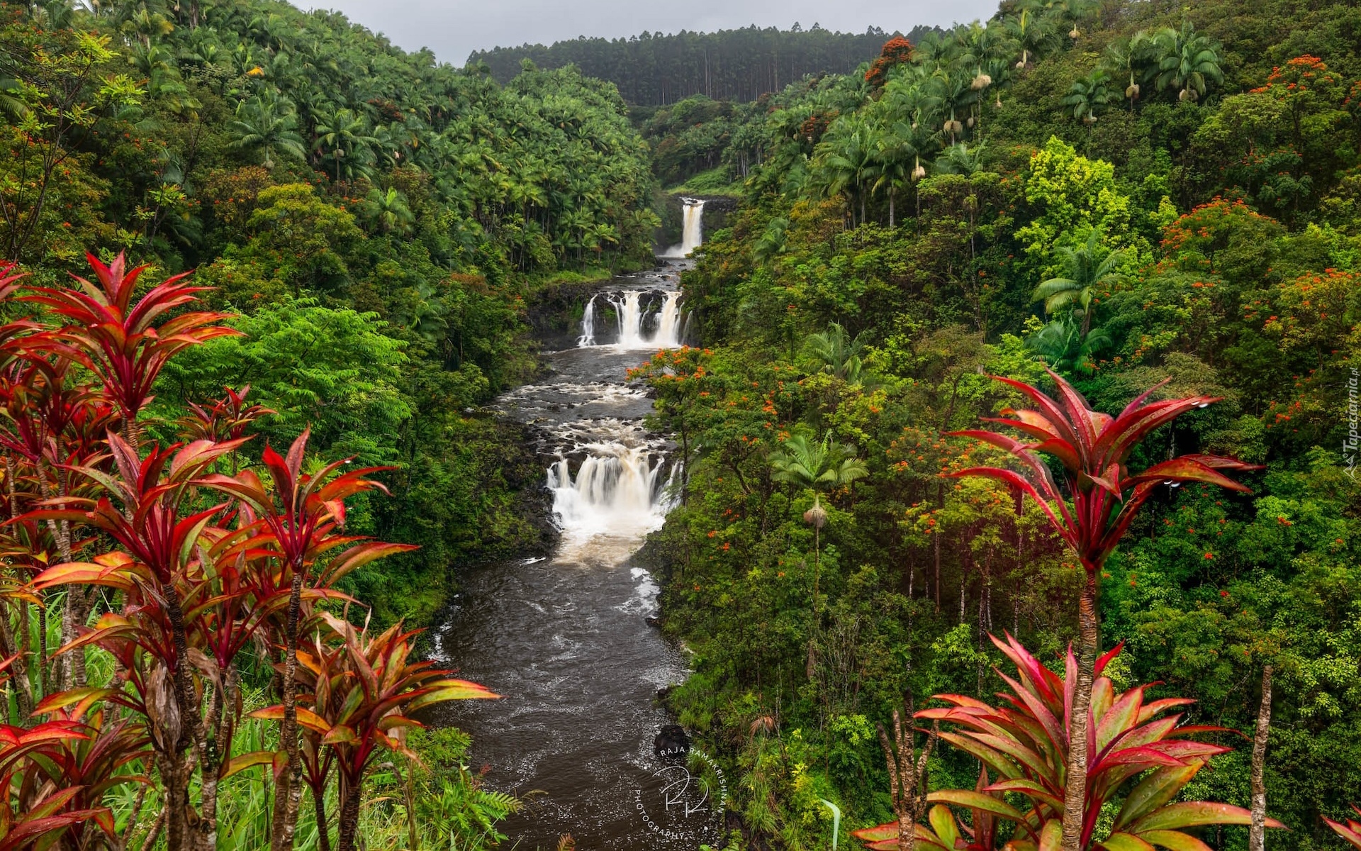 Edytor tapety: Wodospad Umauma Falls wśród drzew na Hawajach