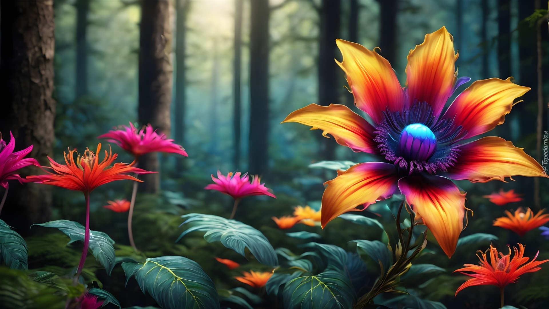 Edytor tapety: Kolorowe kwiaty na tle zamglonego lasu w grafice
