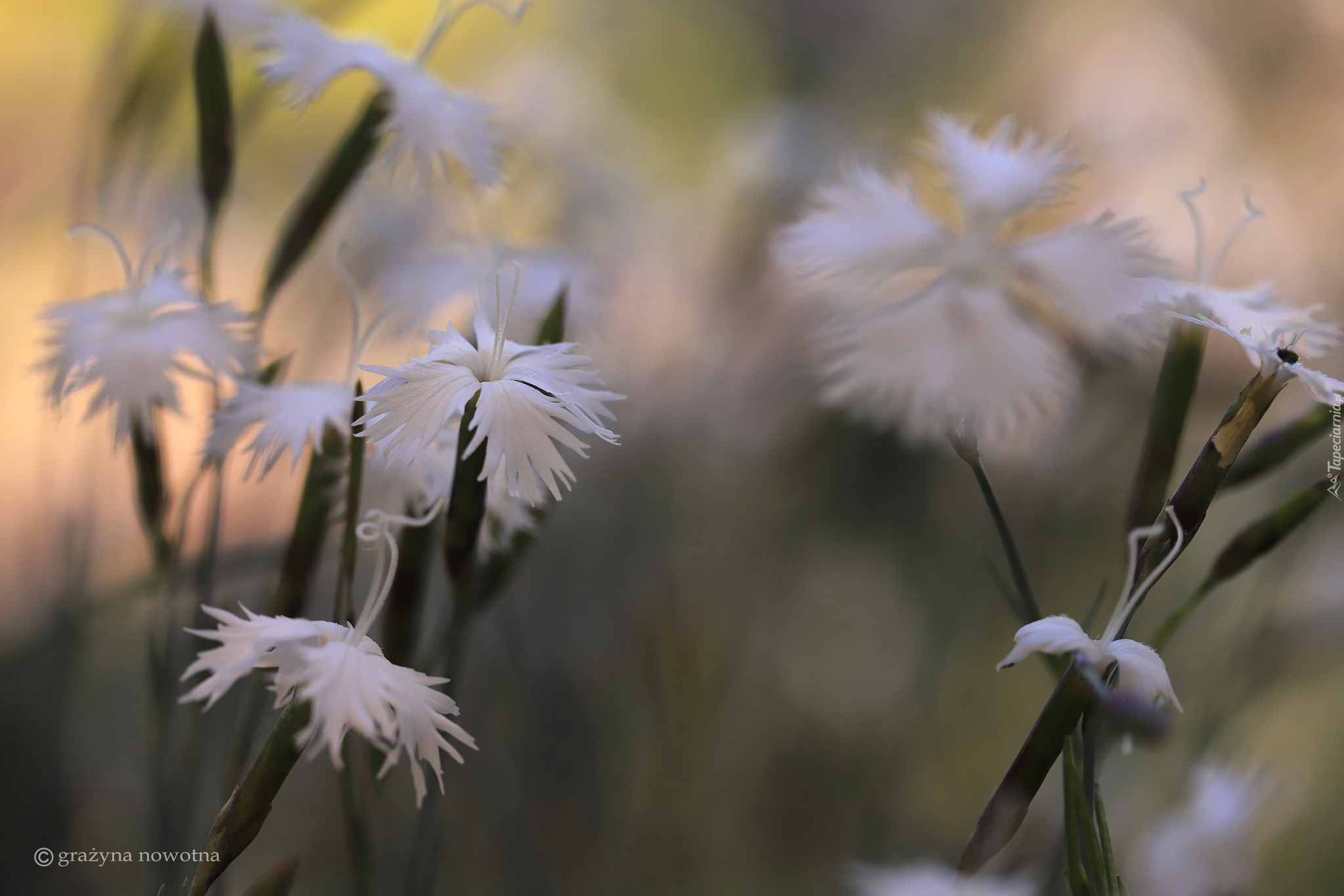 Edytor tapety: Białe goździki na rozmytym tle w zbliżeniu