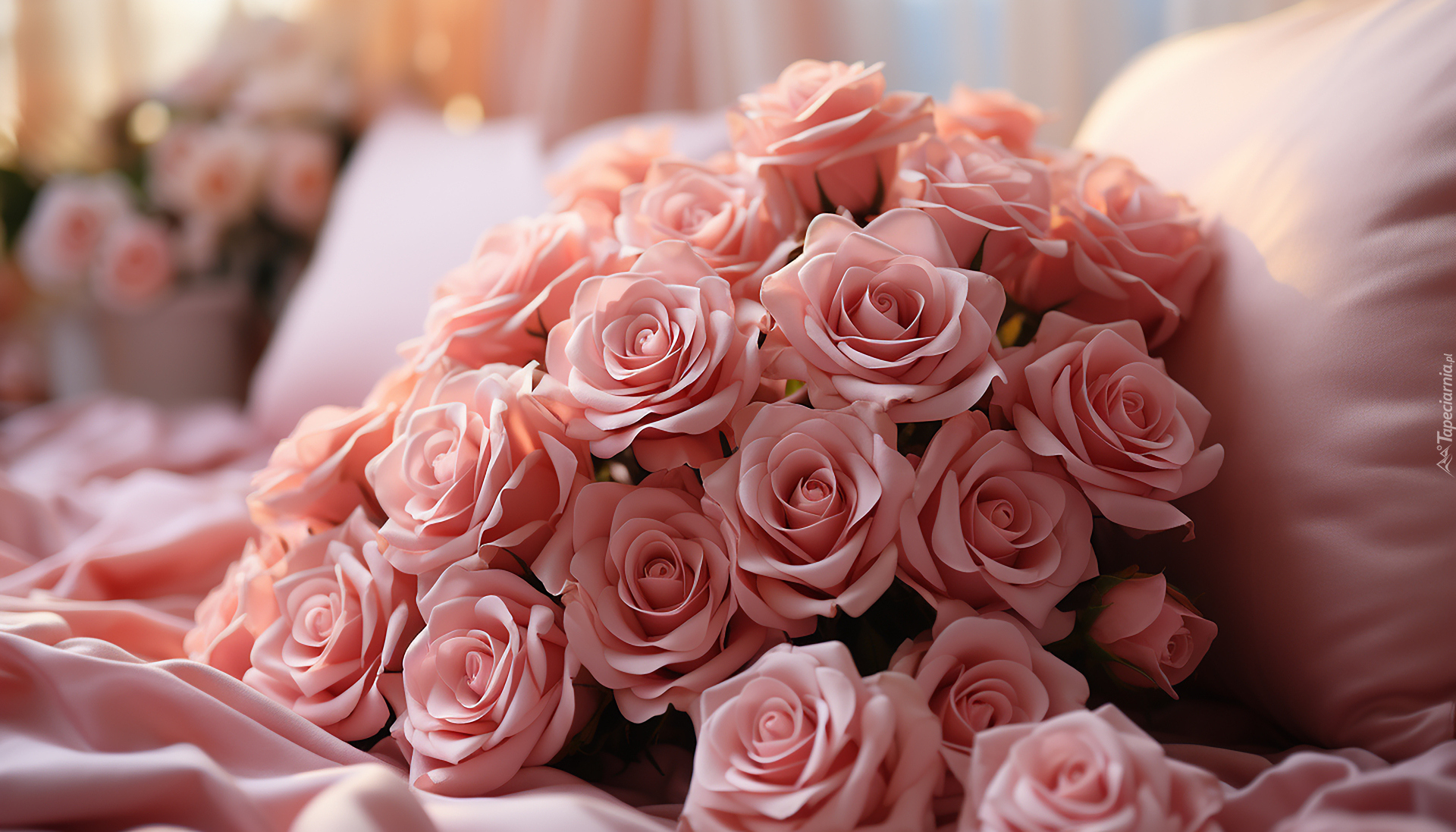 Edytor tapety: Bukiet różowych róż na poduszkach