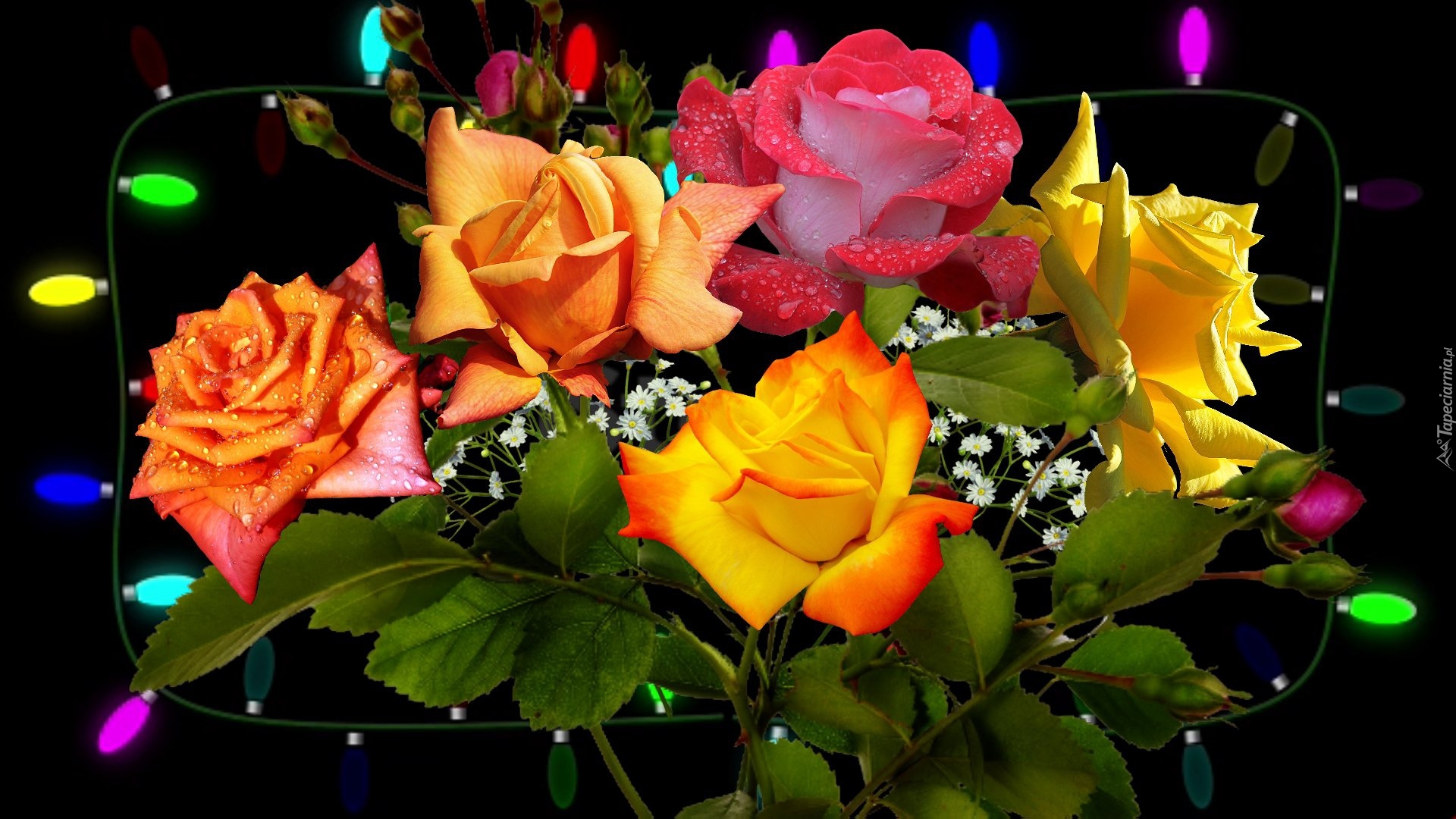 Edytor tapety: Zroszone kolorowe róże otoczone lampkami