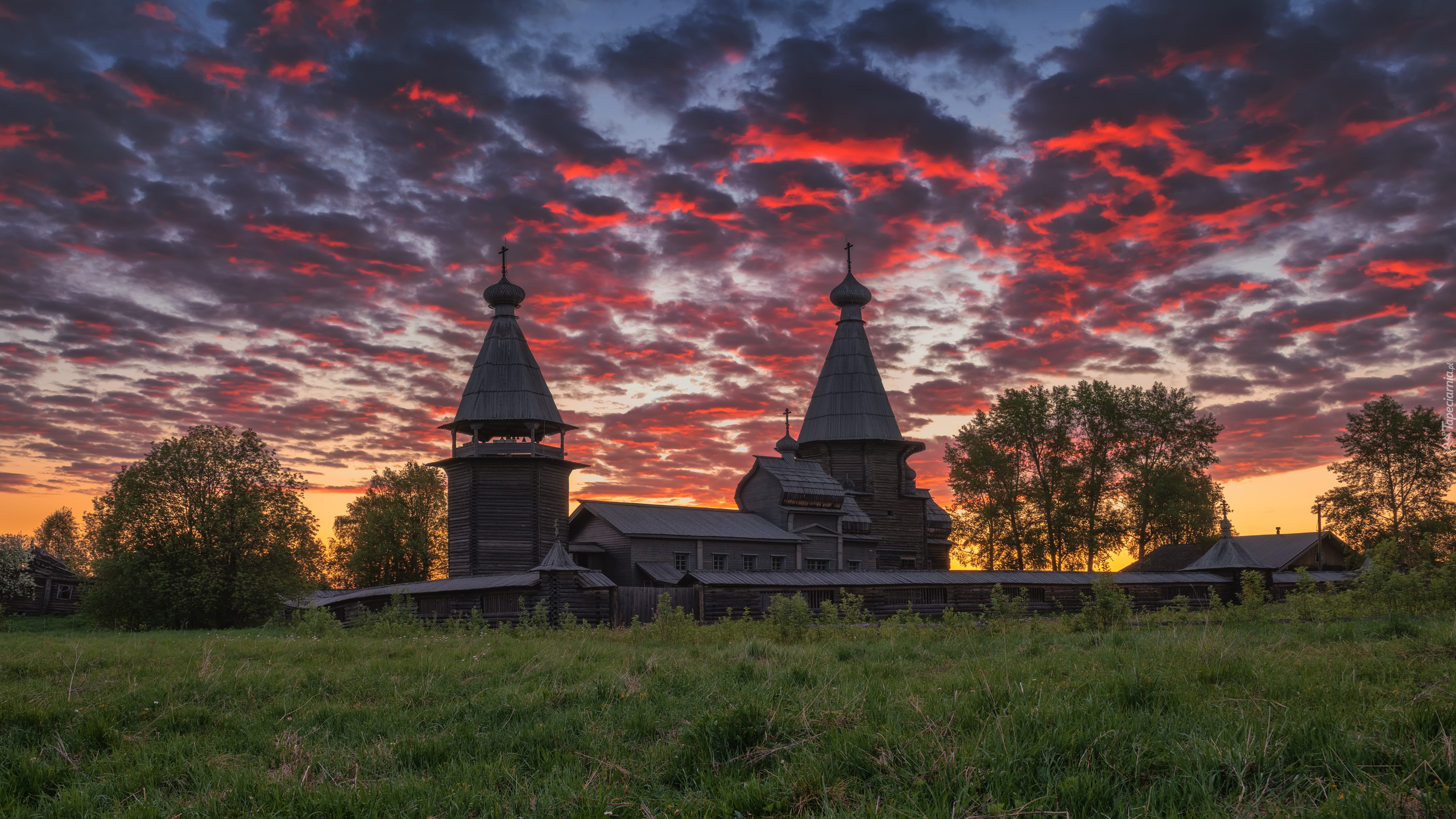 Edytor tapety: Chmurne kolorowe niebo nad cerkwią na polu