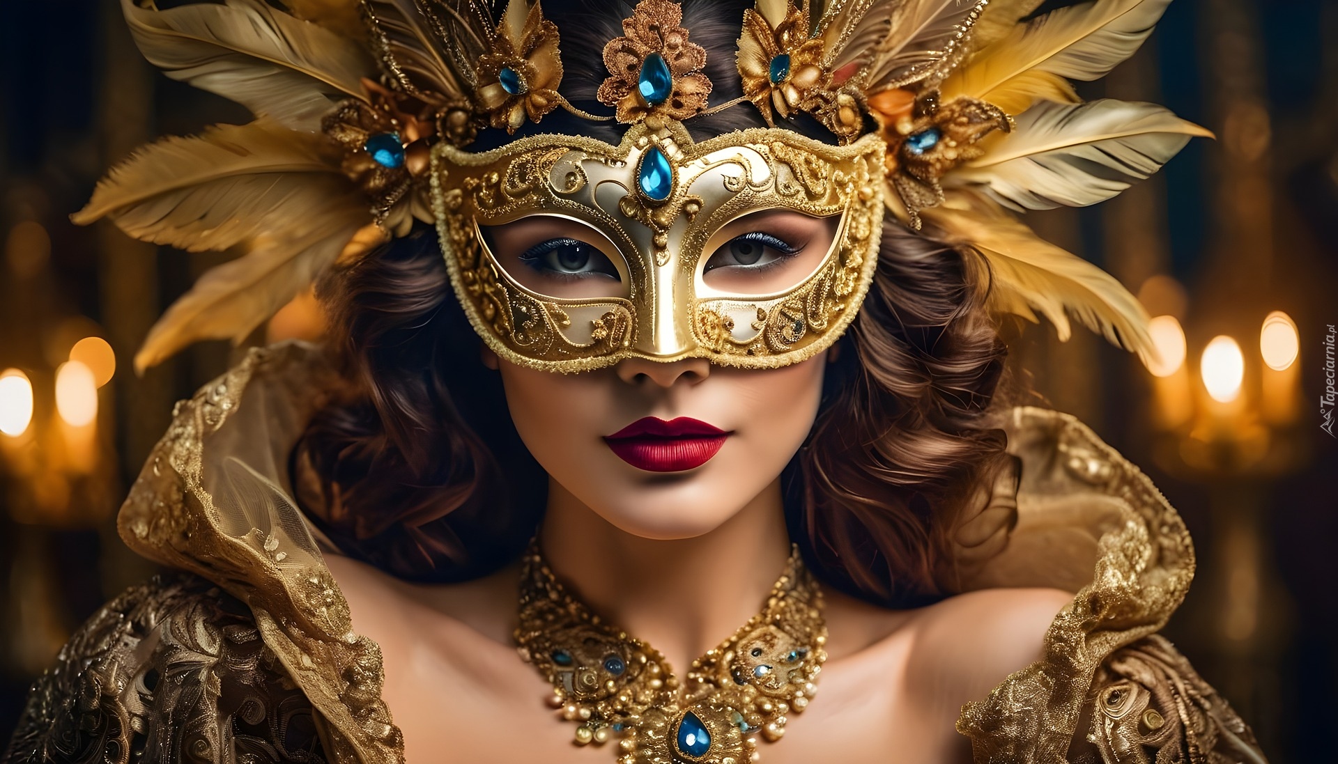 Edytor tapety: Kobieta w masce karnawałowej i piórami we włosach