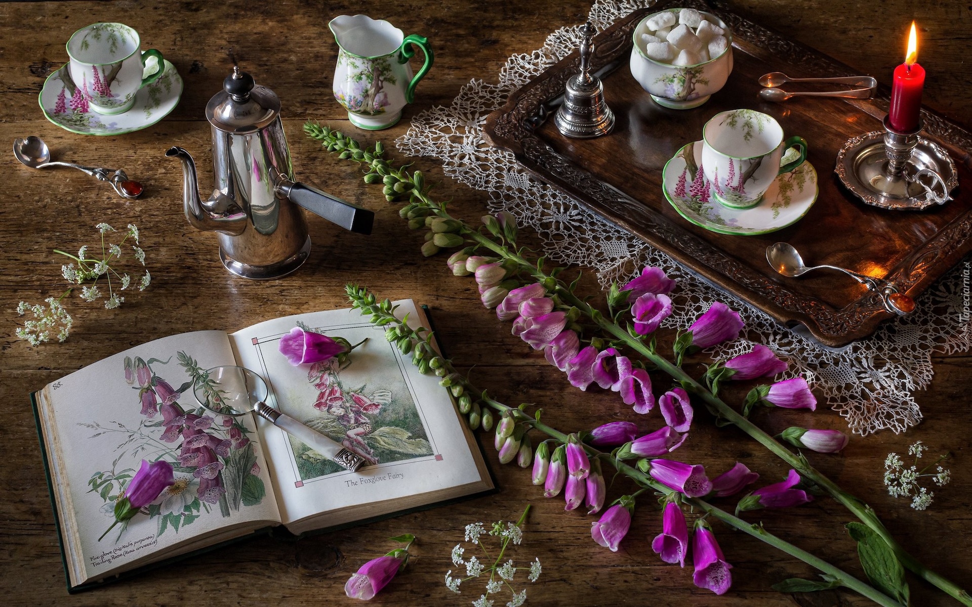 Edytor tapety: Serwis kawowy i kwiaty obok książki na stole