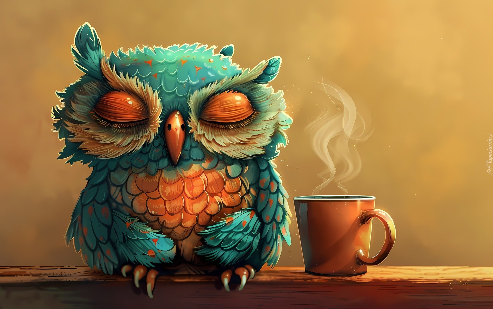 Edytor tapety: Sowa obok kubka z parującą kawą