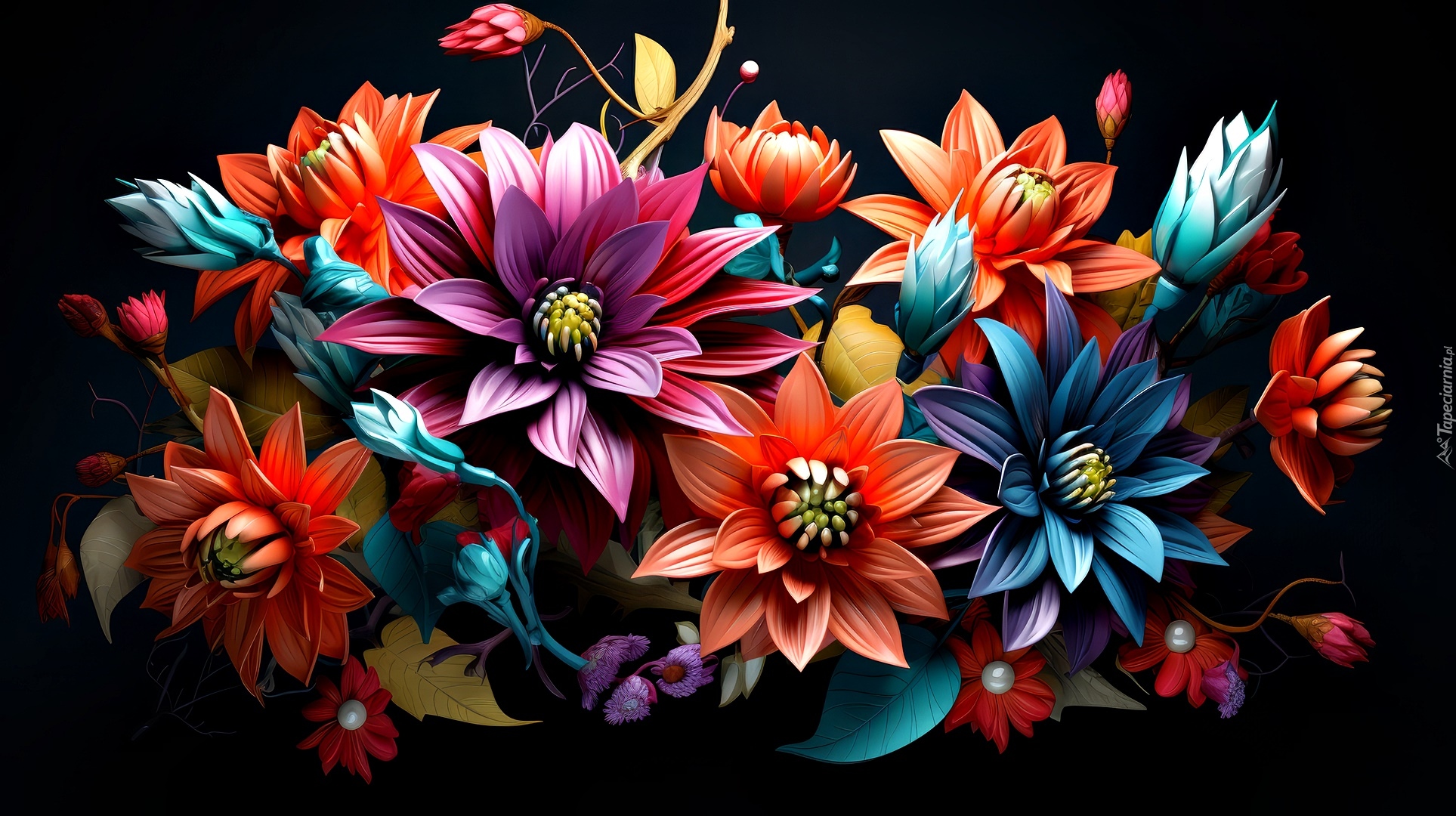Edytor tapety: Grafika kolorowych kwiatów na czarnym tle