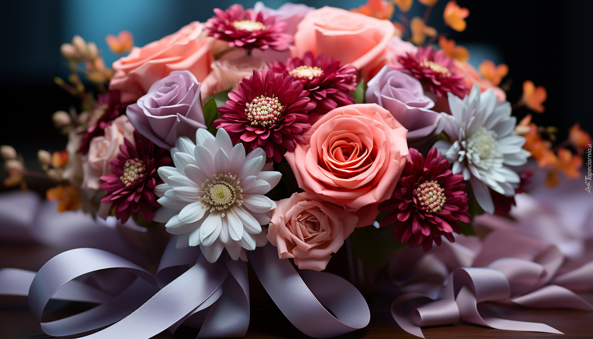 Edytor tapety: Bukiet różnorodnych kwiatów z kokardą