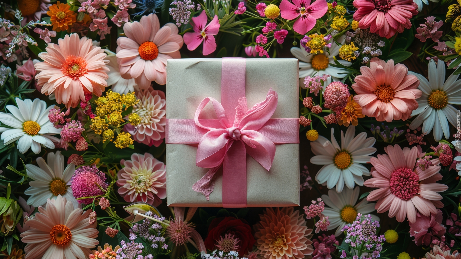 Edytor tapety: Prezent z różową wstążką na kwiatach