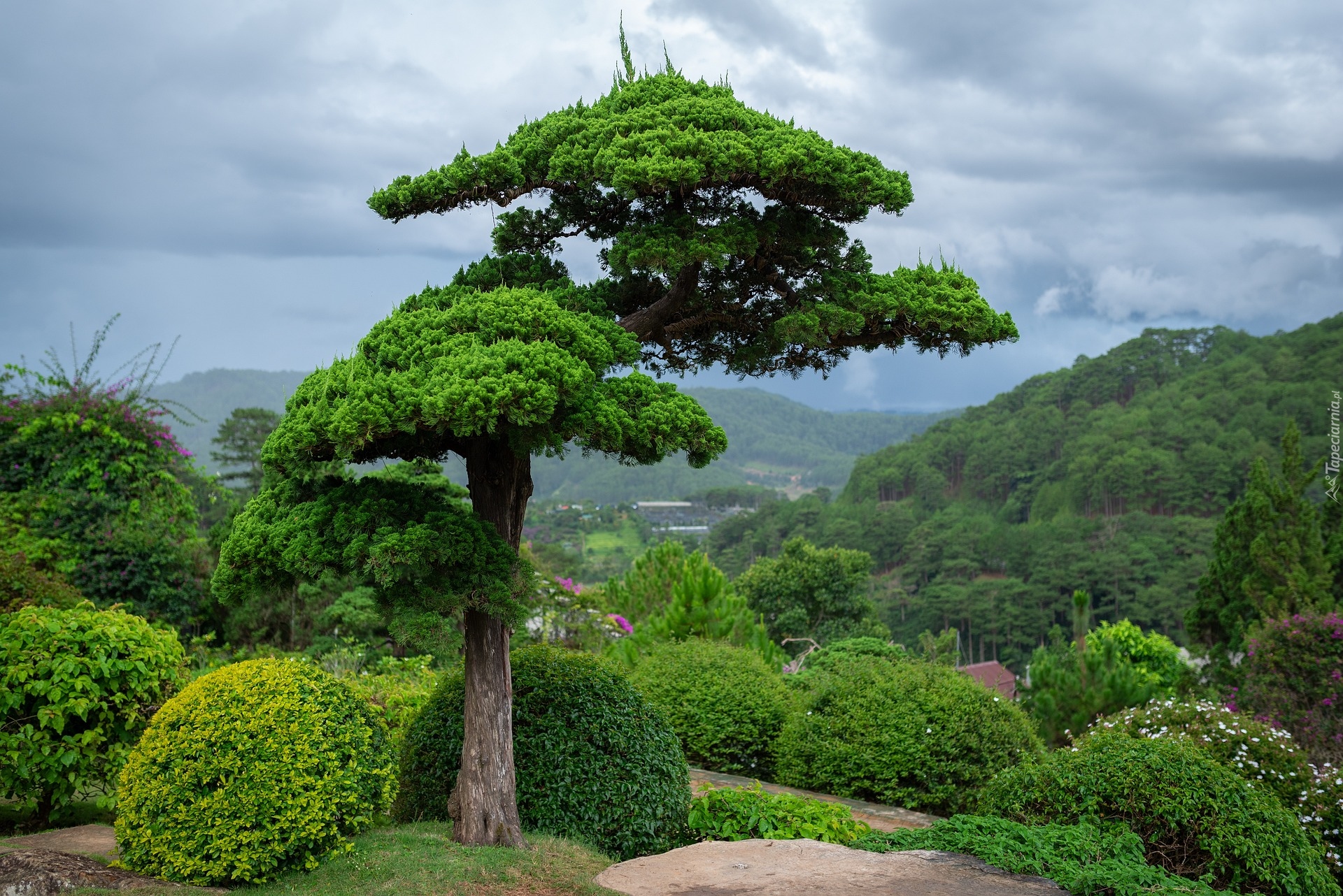 Edytor tapety: Drzewo bonsai i zalesione góry w tle