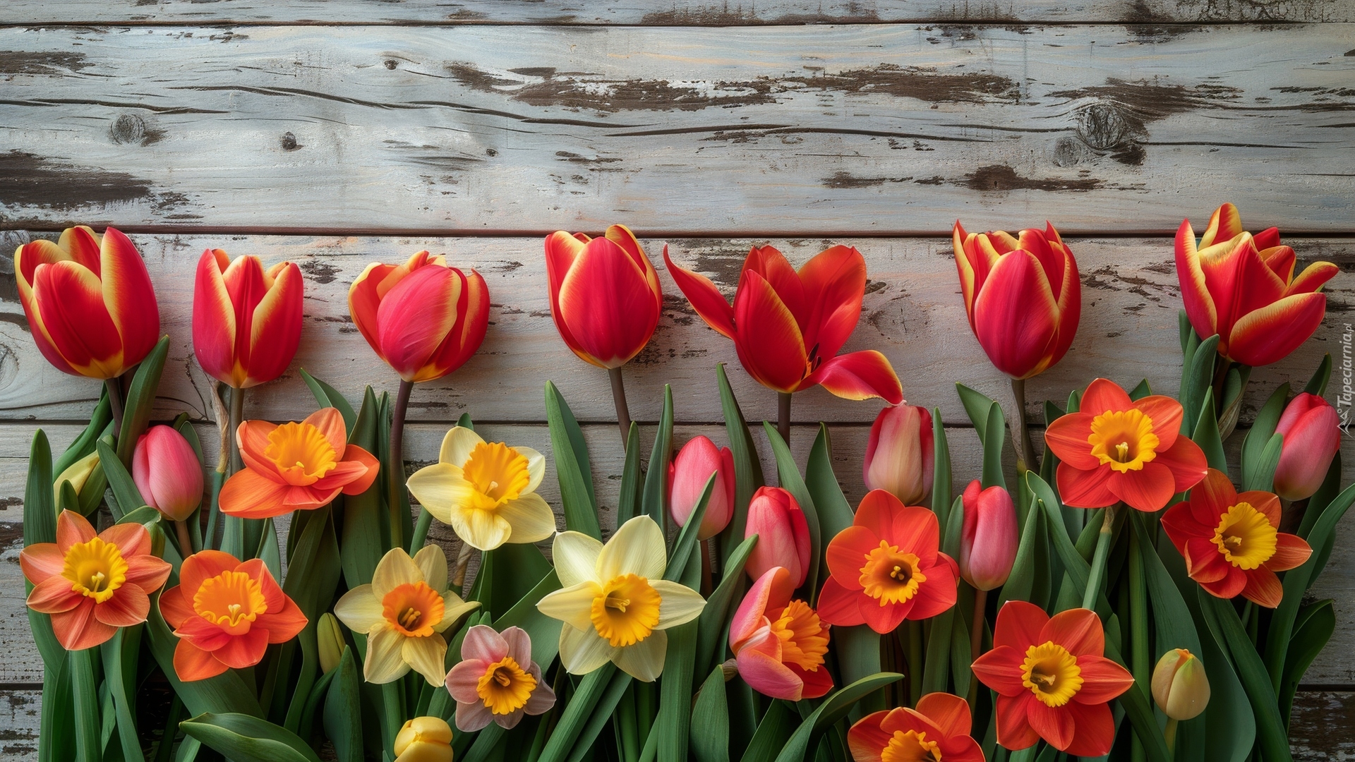 Edytor tapety: Tulipany i narcyzy żonkile na deskach
