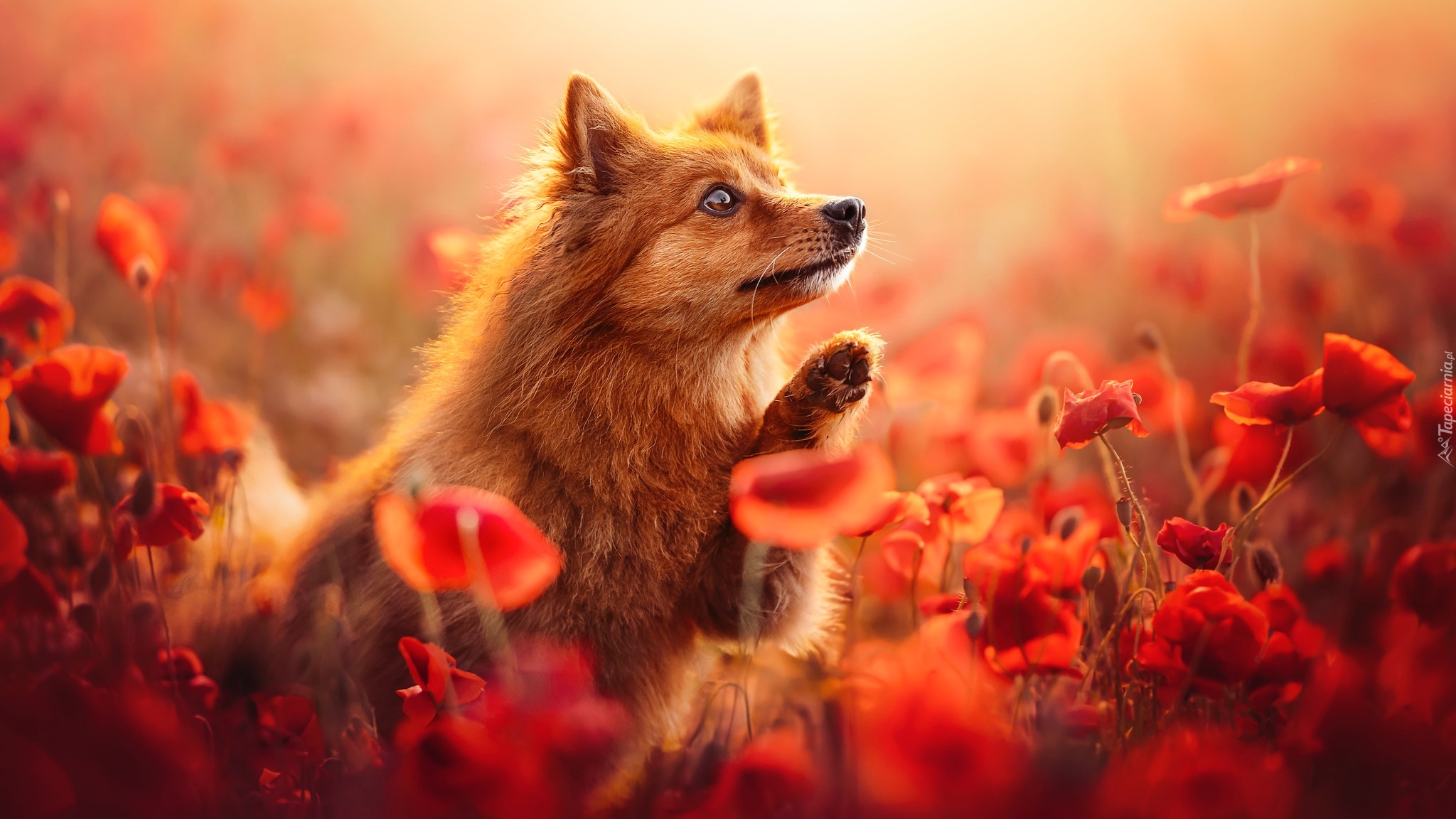 Edytor tapety: Pies z podniesioną łapą wśród maków