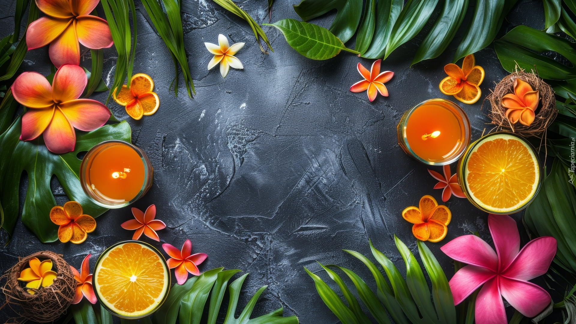 Edytor tapety: Plumeria i świeczki na ciemnym tle
