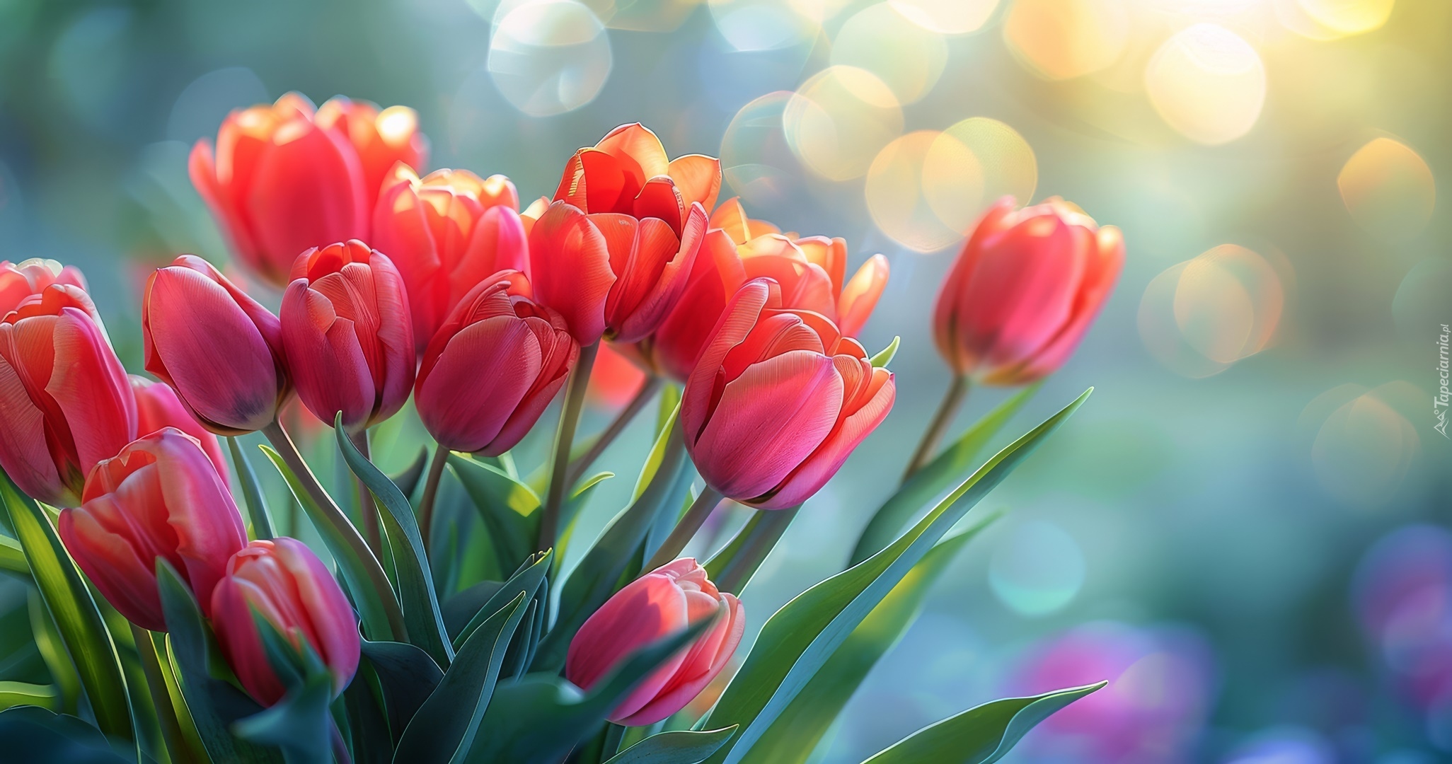 Edytor tapety: Czerwone tulipany na rozmytym kolorowym tle