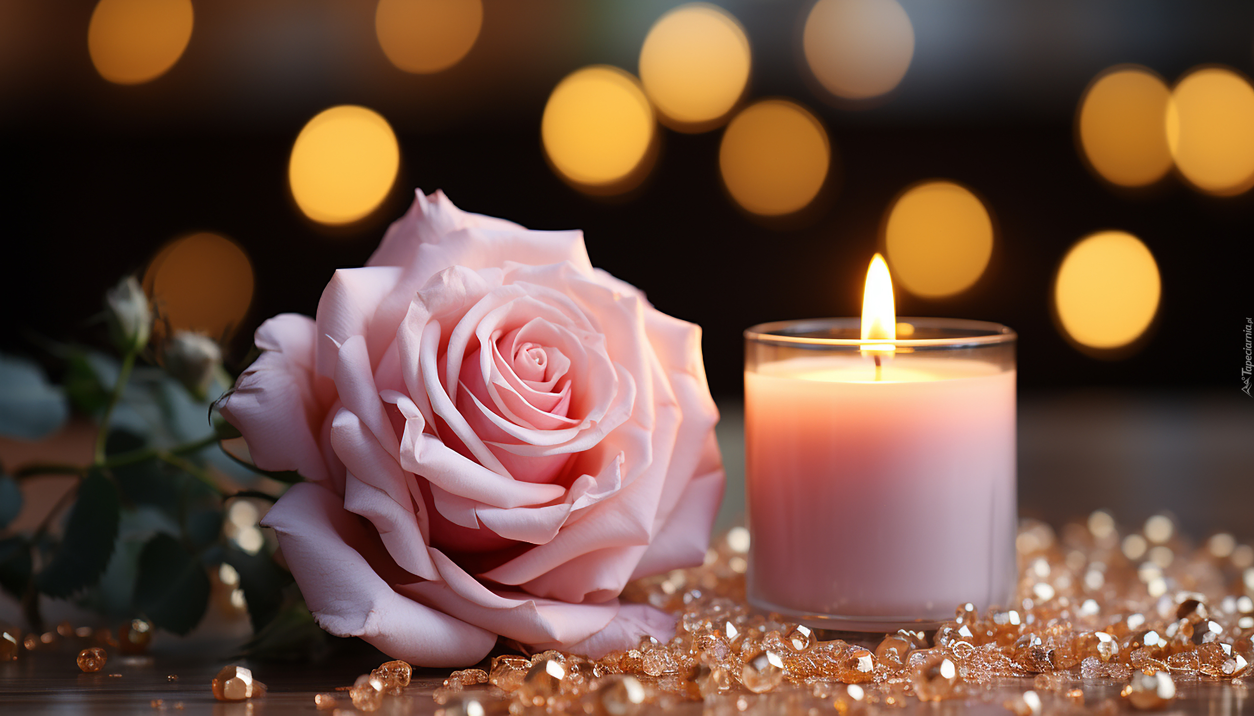 Edytor tapety: Bladoróżowa róża obok płonącej świeczki