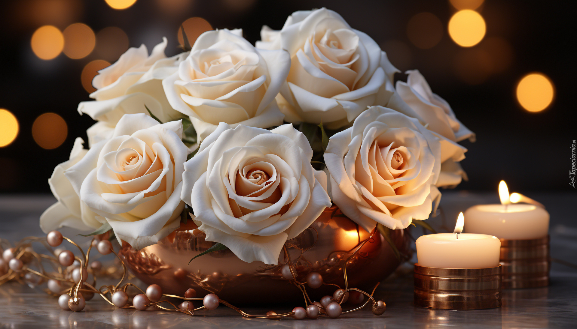 Edytor tapety: Bukiet białych róż i białe płonące świece