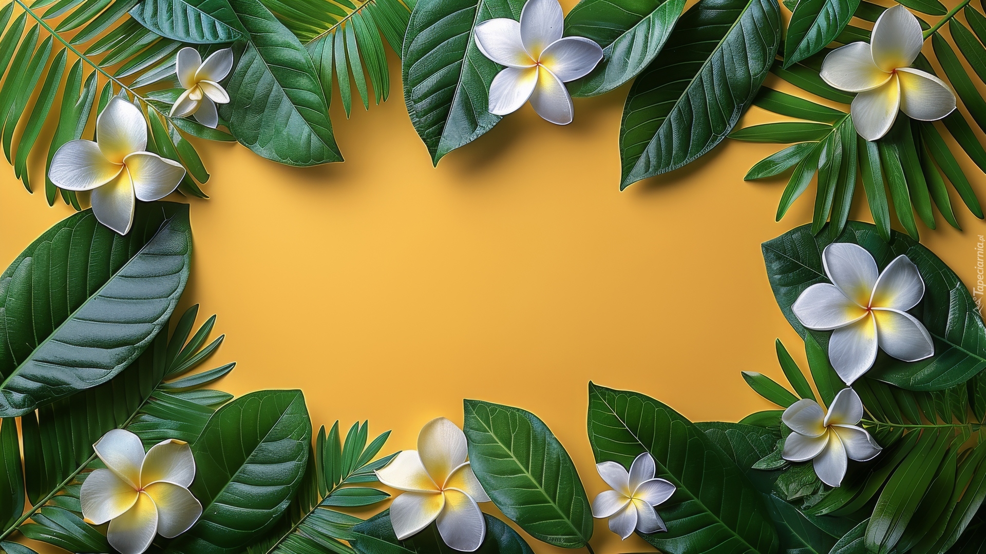 Edytor tapety: Białe kwiaty plumerii i liście na żółtym tle