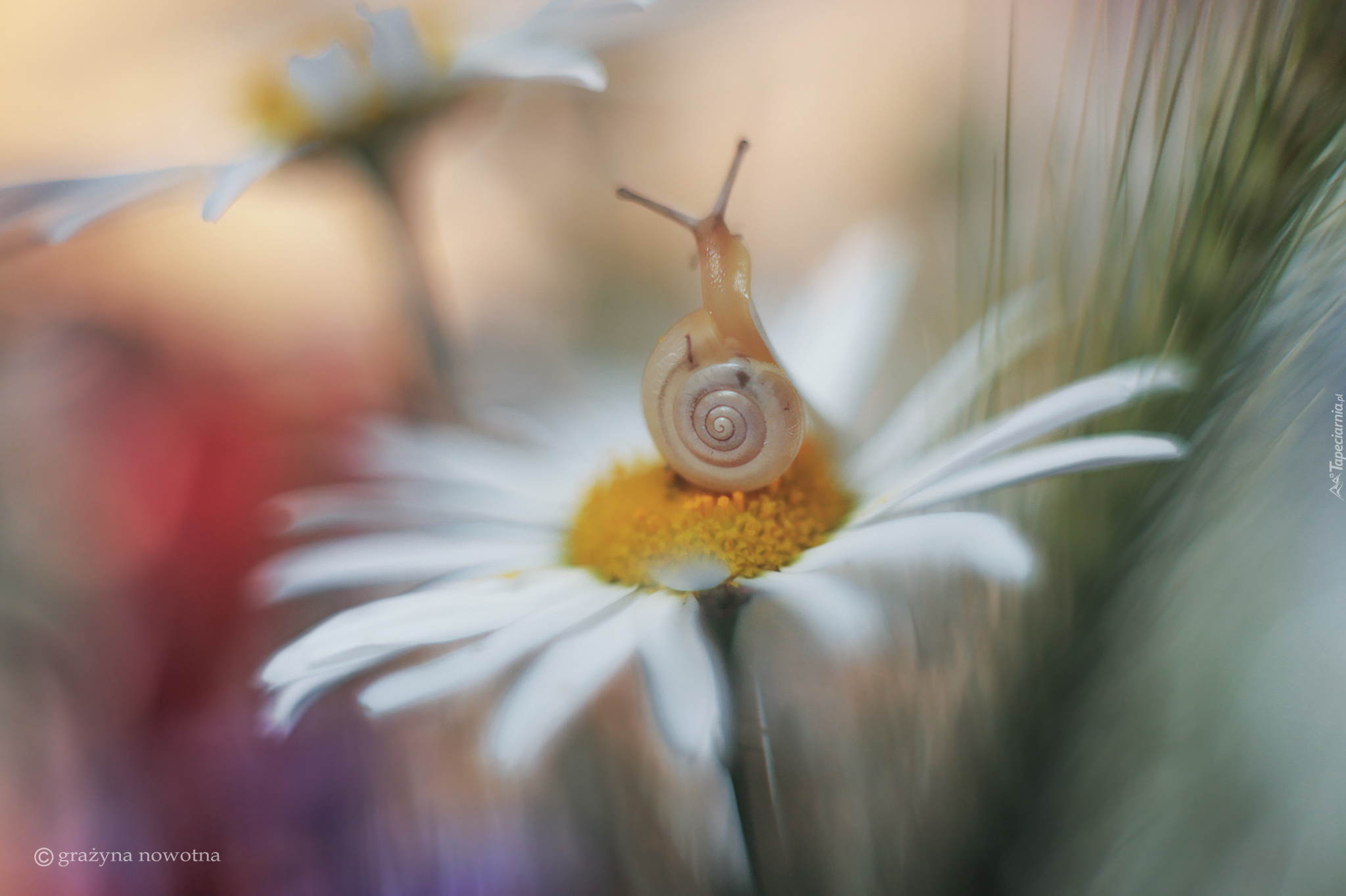 Edytor tapety: Ślimak na rozmytym kwiatku margerytki