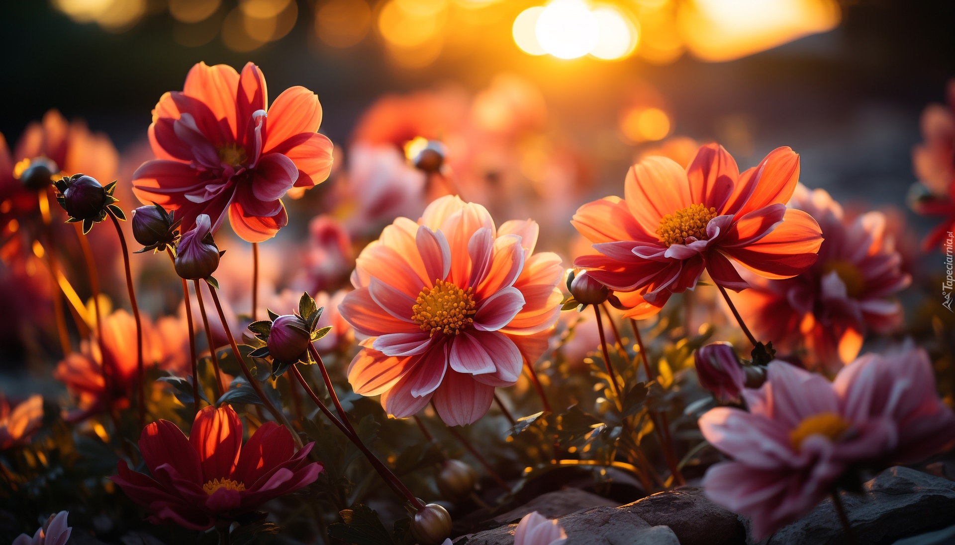 Edytor tapety: Rozwinięte kwiaty z pąkami w blasku słońca