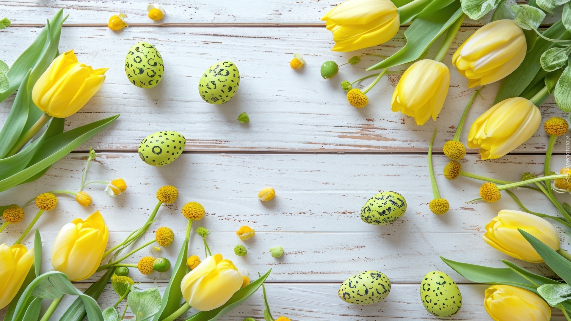 Edytor tapety: Żółte tulipany z pisankami na białych deskach