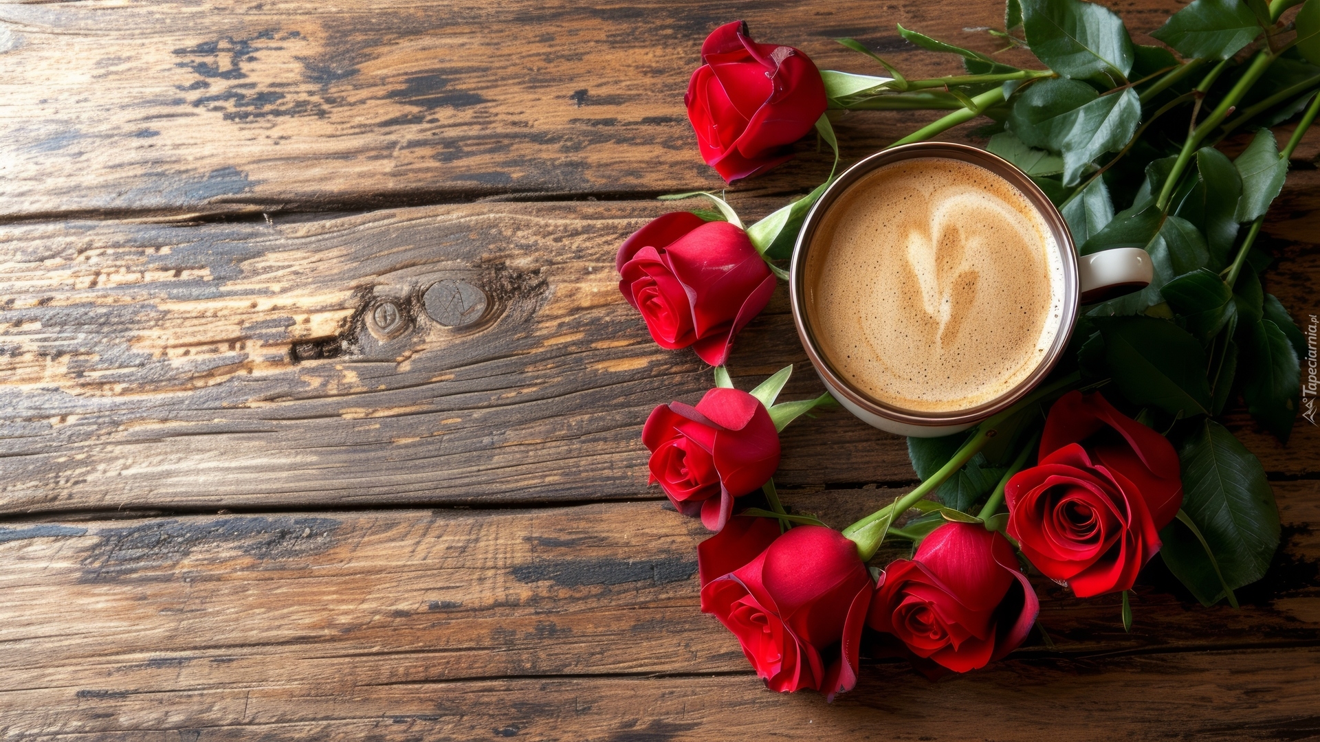 Edytor tapety: Filiżanka z kawą i róże na drewnianych deskach