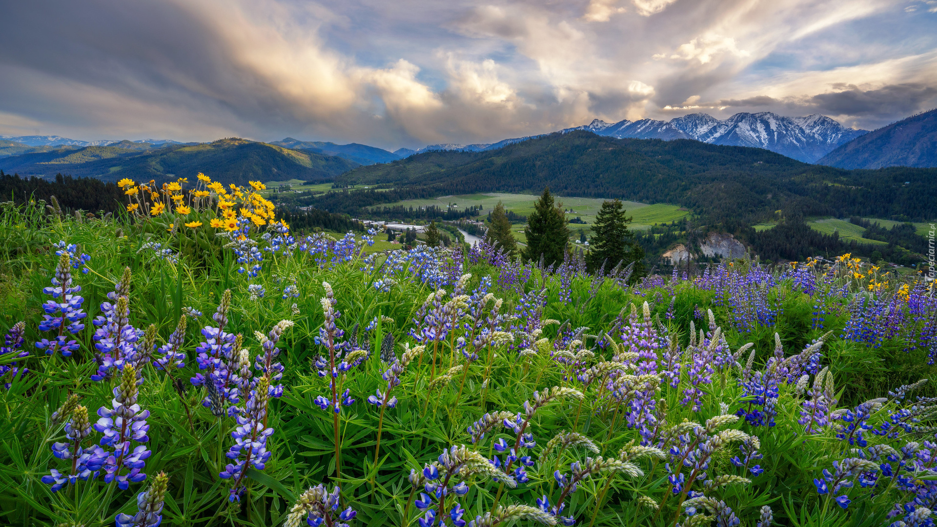 Edytor tapety: Kwiaty na łące na tle chmur nad górami