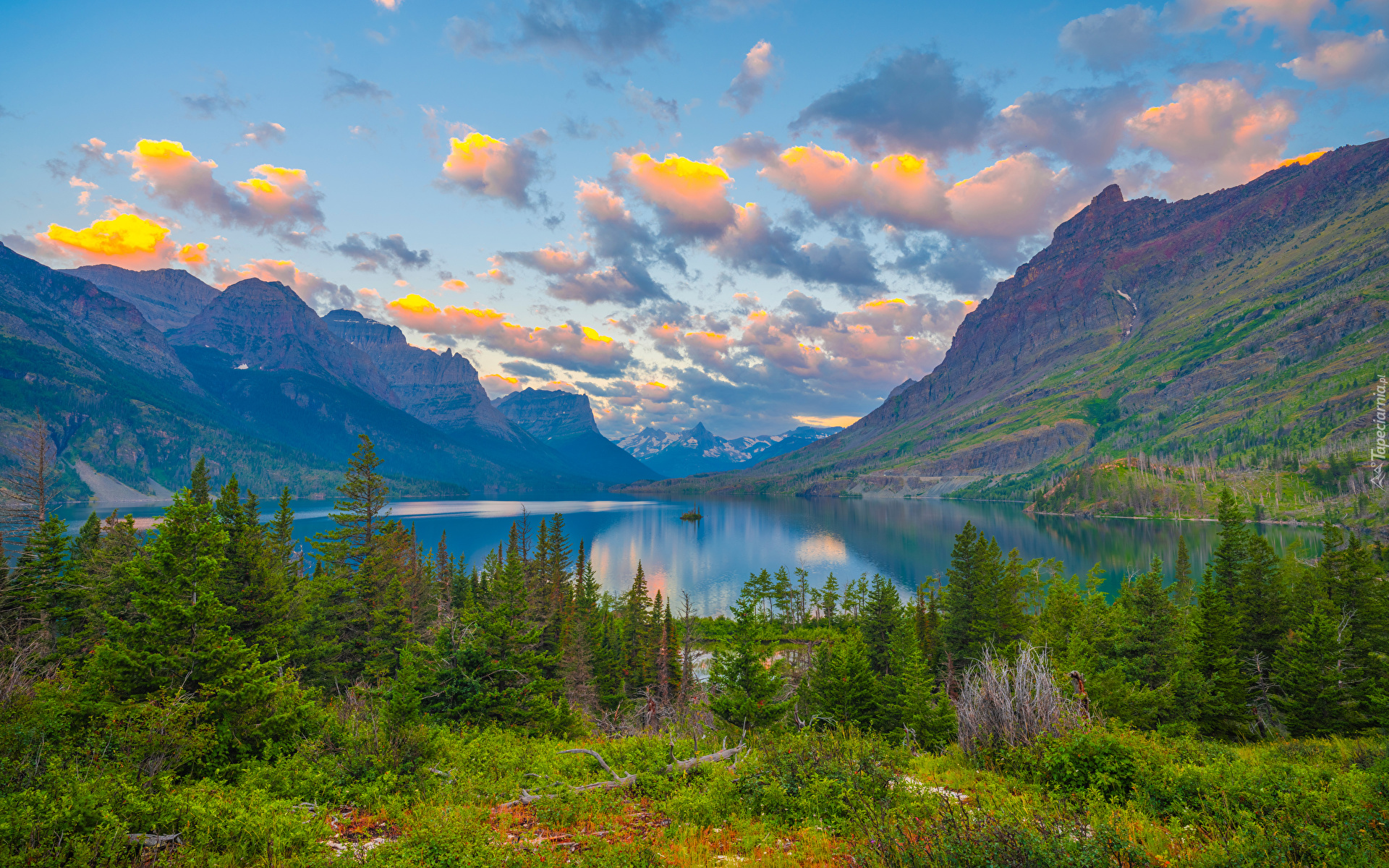 Edytor tapety: Kolorowe chmury nad jeziorem i górami w ParkuNarodowymGlacier