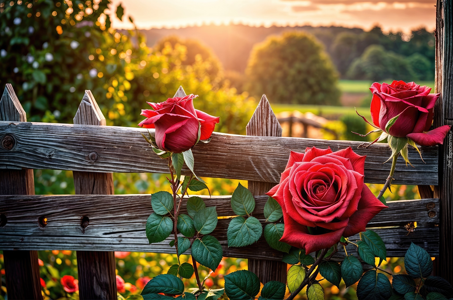 Edytor tapety: Czerwone róże przy drewnianym płocie