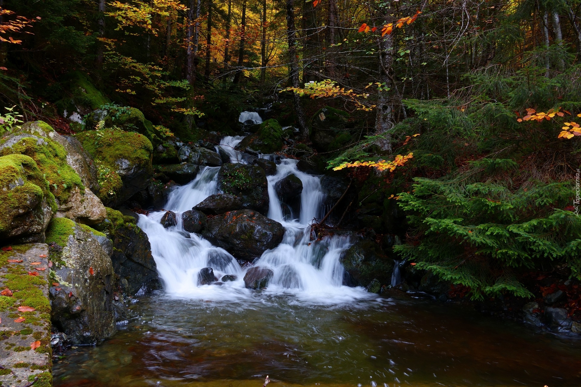 Edytor tapety: Wodospad spadający do rzeki w lesie