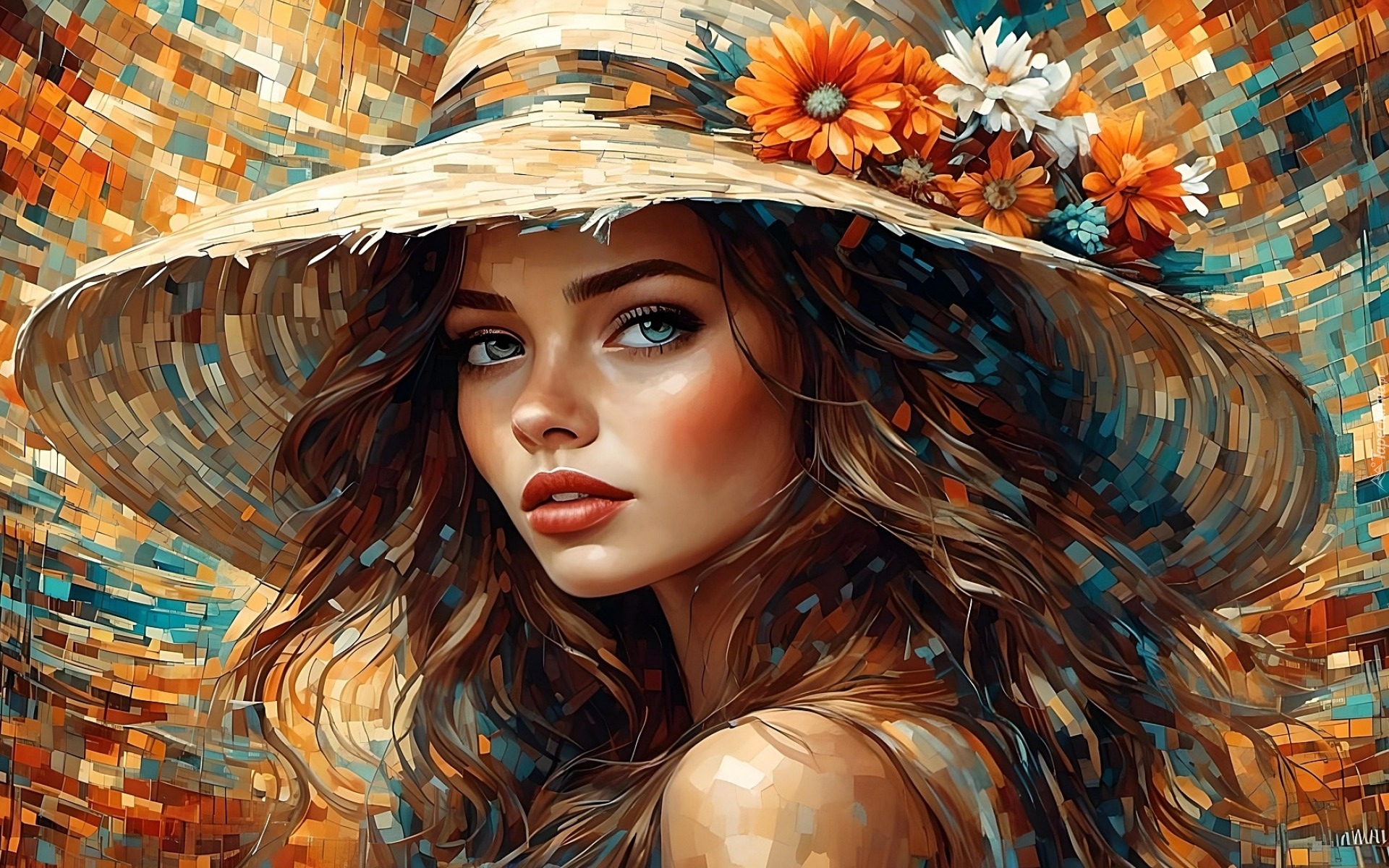 Edytor tapety: Twarz kobiety w słomkowym kapeluszu na kolorowym tle