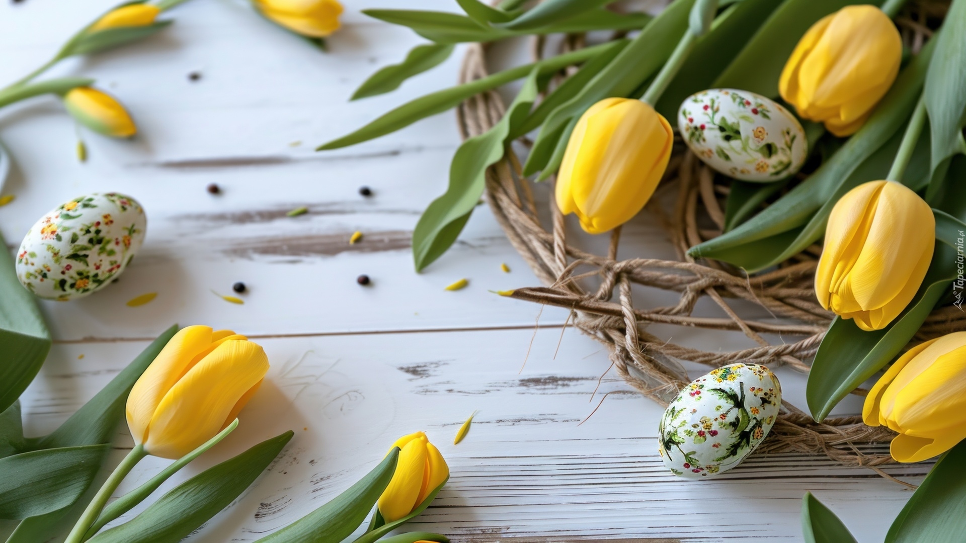 Edytor tapety: Pisanki i żółte tulipany na białych deskach