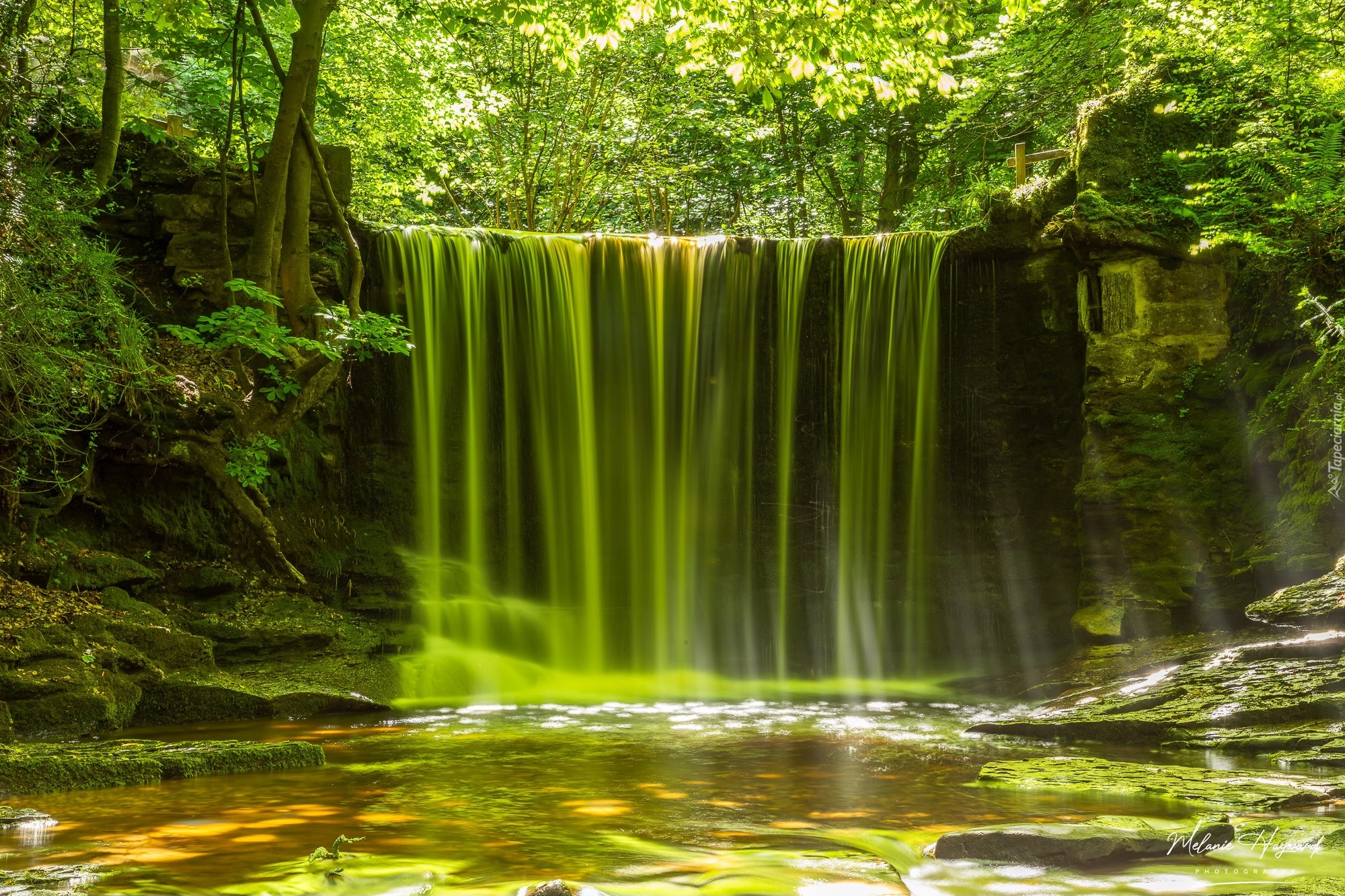 Edytor tapety: Rozświetlone słońcem drzewa i wodospad na skałach